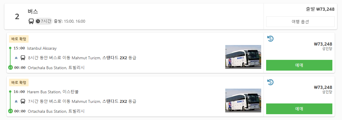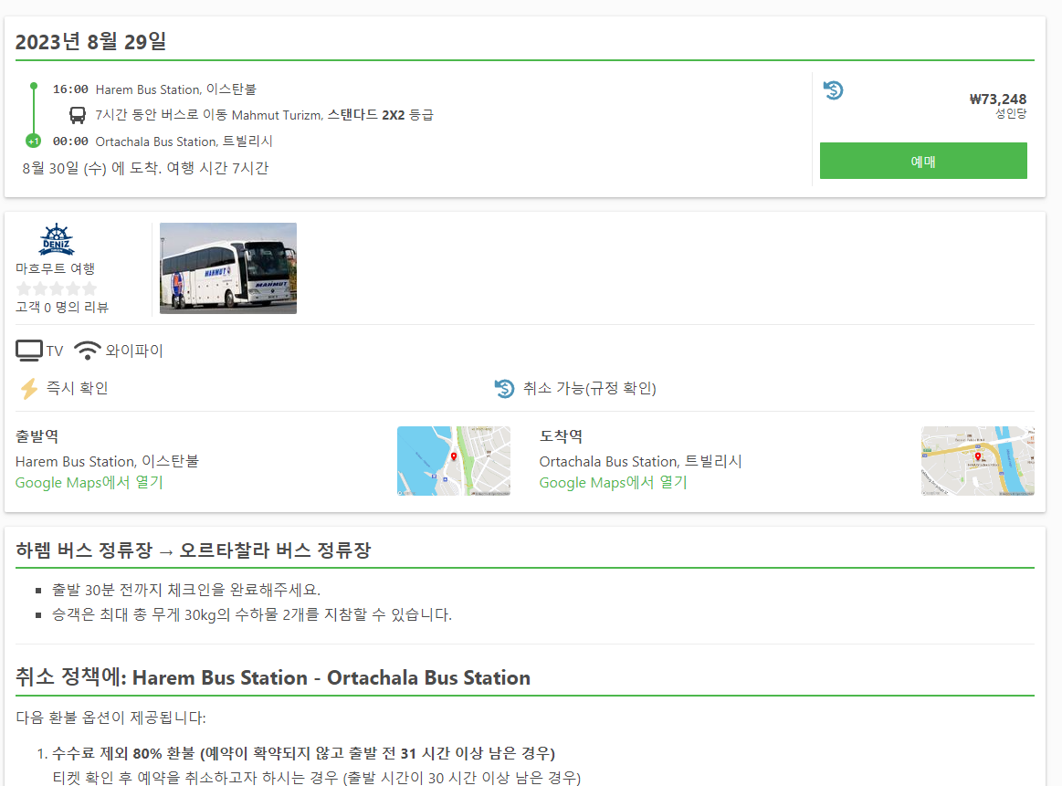 이스탄불에서 트빌리시로 이동하는 교통편 노선정보 및 예약은 12go사이트에서 예약하실 수 있으며, 이 노선 뿐만아니라 나라전역의 노선, 나라간 노선의 검색가능한 모든 교통편을 검색하고 예약하실 수 있습니다. 한국어로 검색해보시고 나오지 않으면 영어로 검색하시면 보다 쉽게 노선을 확인하실 수 있습니다.