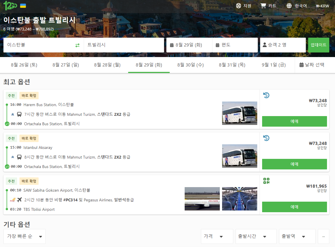 이스탄불에서 트빌리시로 이동하는 교통편은 유명한 12go사이트를 비롯해 스카이스캐너, omio 사이트를 함께 비교해서 가성비 좋은 교통편을 이용하시는 것이 좋습니다.