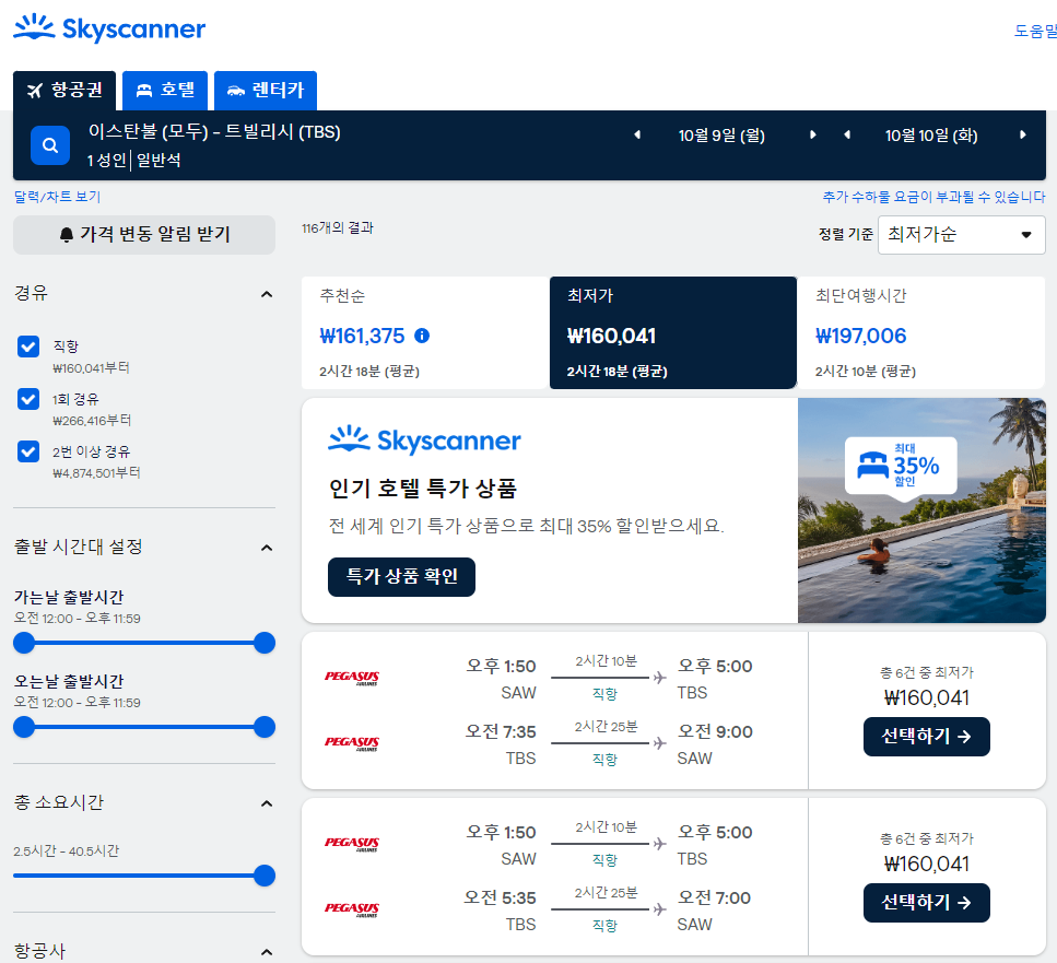 스카이 스캐너 사이트에서 이스탄불에서 트빌리시로 가는