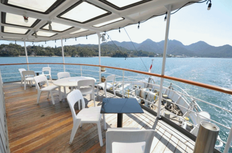 점심 식사는 선상 셰프가 제철 재료를 사용하여 준비한 풀코스 식사를 즐기십시오. 히로시마로 돌아가는 길에 세토나이카이의 여러 섬을 포함하여 배를 지나는 경치를 즐기십시오.