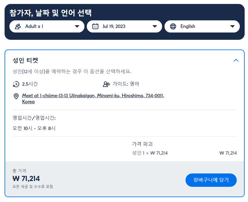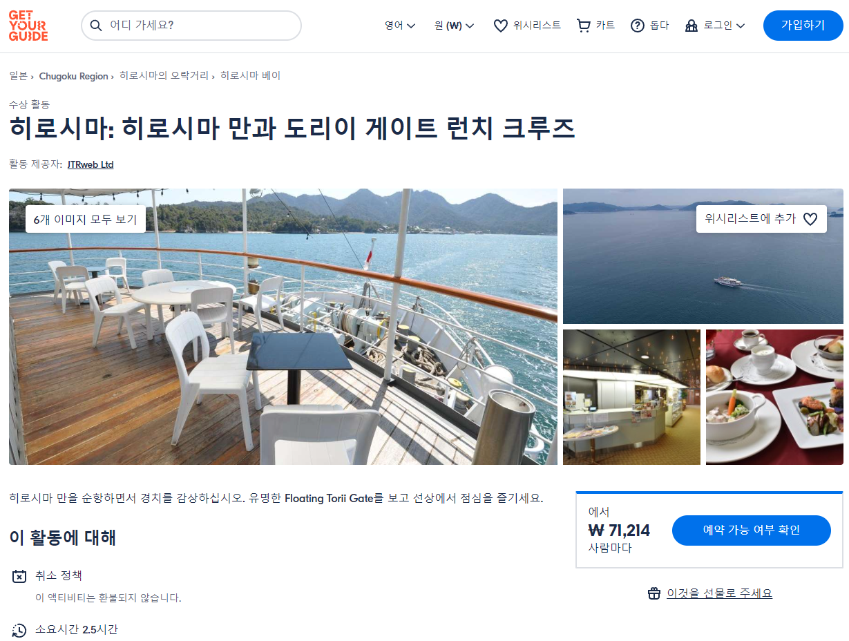 히로시마여행 히로시마 만과 도리이 게이트 런치 크루즈 (Hiroshima Bay and Torii Gate Lunch Cruise)는 GET YOUR GUIDE 사이트에서 예약하실 수 있습니다. 사이트는 특히 전세계 대부분의 나라, 지역의 투어, 교통편 있어, 쉽게 찾을 수 없는 여행지의 다양한 투어 및 서비스를 이용할 수 있는 글로벌 사이트로 한국어사이트는 지원하지 않습니다. (글로벌 한국어 여행사이트를 찾으신다면 klook 여행사이트 추천합니다. 함께 사용하시면 더욱 편하게 여행하실 수 있습니다. klook에 찾는 정보가 없다면 GET YOUR GUIDE에서 찾으시면 됩니다.)