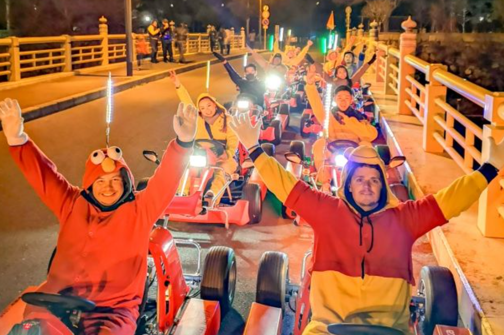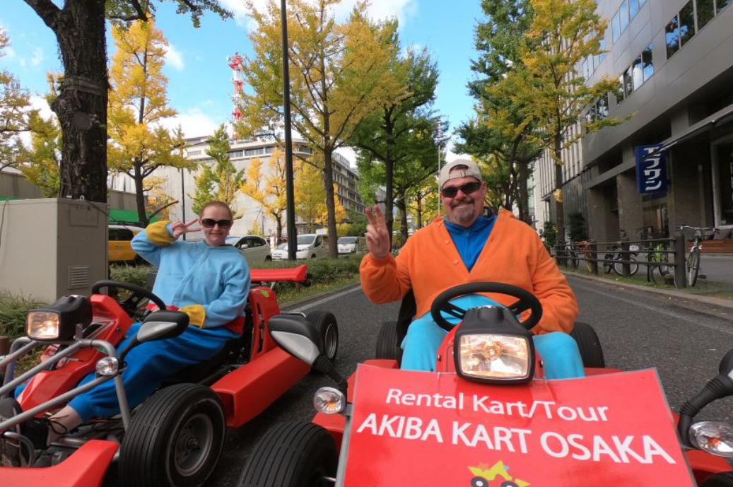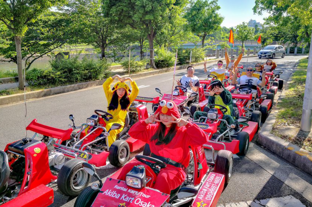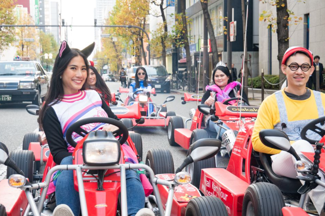 일본 오사카자유여행에 고카트를 타고 오사카의 명소를 탐험하고 좋아하는 캐릭터로 차려 입고 공공 도로를 달리세요.
