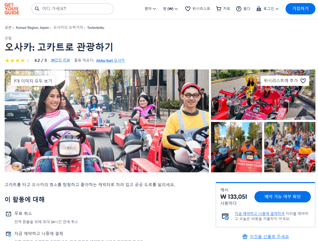 오사카 고카트로 관광하기(Osaka See the Sights by Go-kart)는 GET YOUR GUIDE 사이트에서 예약하실 수 있습니다. 사이트는 특히 전세계 대부분의 나라, 지역의 투어, 교통편 있어, 쉽게 찾을 수 없는 여행지의 다양한 투어 및 서비스를 이용할 수 있는 글로벌 사이트로 한국어사이트는 지원하지 않습니다. (글로벌 한국어 여행사이트를 찾으신다면 klook 여행사이트 추천합니다. 함께 사용하시면 더욱 편하게 여행하실 수 있습니다. klook에 찾는 정보가 없다면 GET YOUR GUIDE에서 찾으시면 됩니다.)