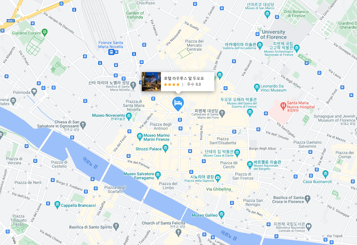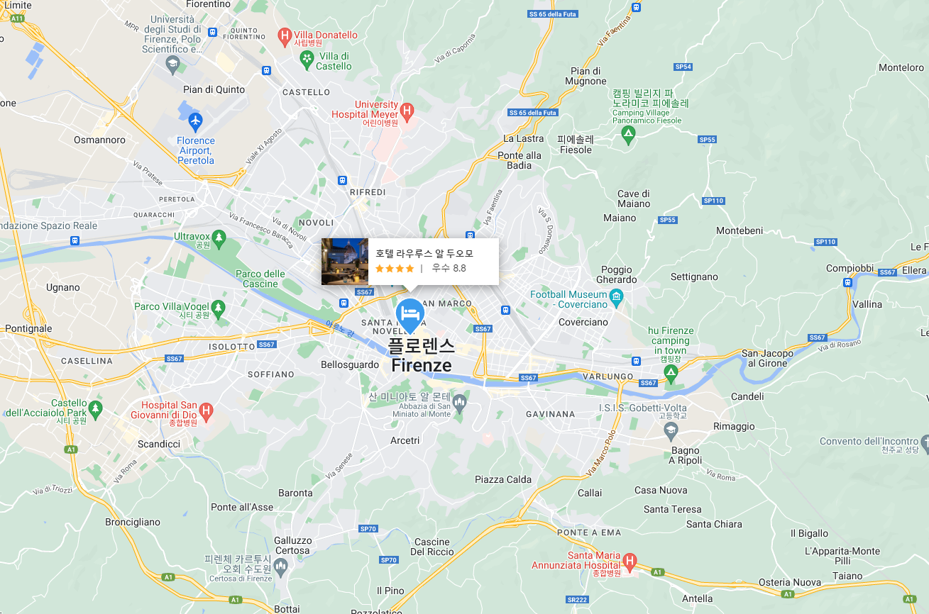 피렌체여행에 여행하기 좋은 위치의 깨끗한 시설을 자랑하는 피렌체 호텔 라우루스 알 두오모 (Hotel Laurus al Duomo)는 두오모, SMN 기차역, 시장까지 도보로 5분 거리에 있으며 Ponte Vecchio, Acadamia 및 Uffizi Galleries까지는 도보로 10분이 소요됩니다.