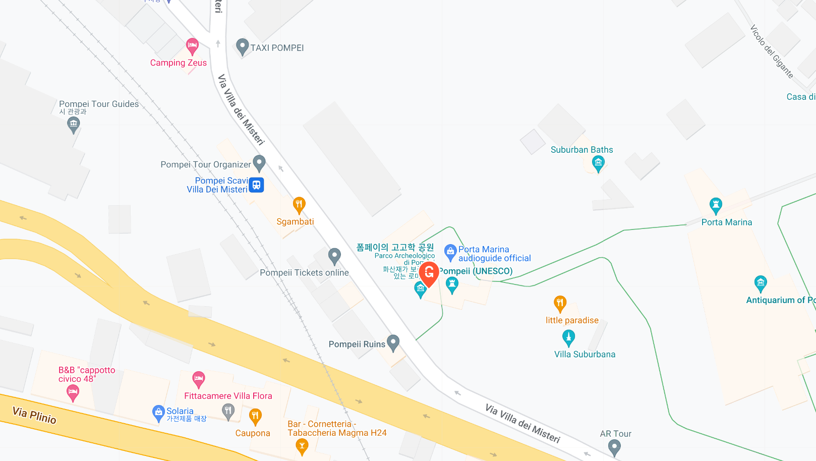 폼페이 정문, Porta Marina Superiore, Via Villa dei Misteri 2에서 가이드를 만나세요. 그들은 외부에 많은 레몬과 오렌지가 매달려 있는 바 레스토랑 Hortus 바로 앞에서 게이트 옆에서 기다릴 것입니다. 가이드에는 현지 파트너의 이름이 적힌 표지판이 있습니다. 만남의 장소는 Circumvesuviana 기차역 Pompei-Villa dei Misteri에서 불과 몇 걸음 거리에 있습니다. Porta Marina Superiore에는 무료 수하물 보관소가 있습니다.