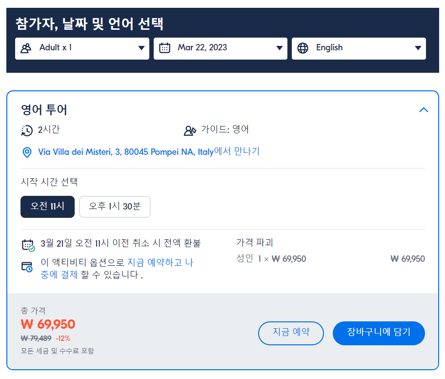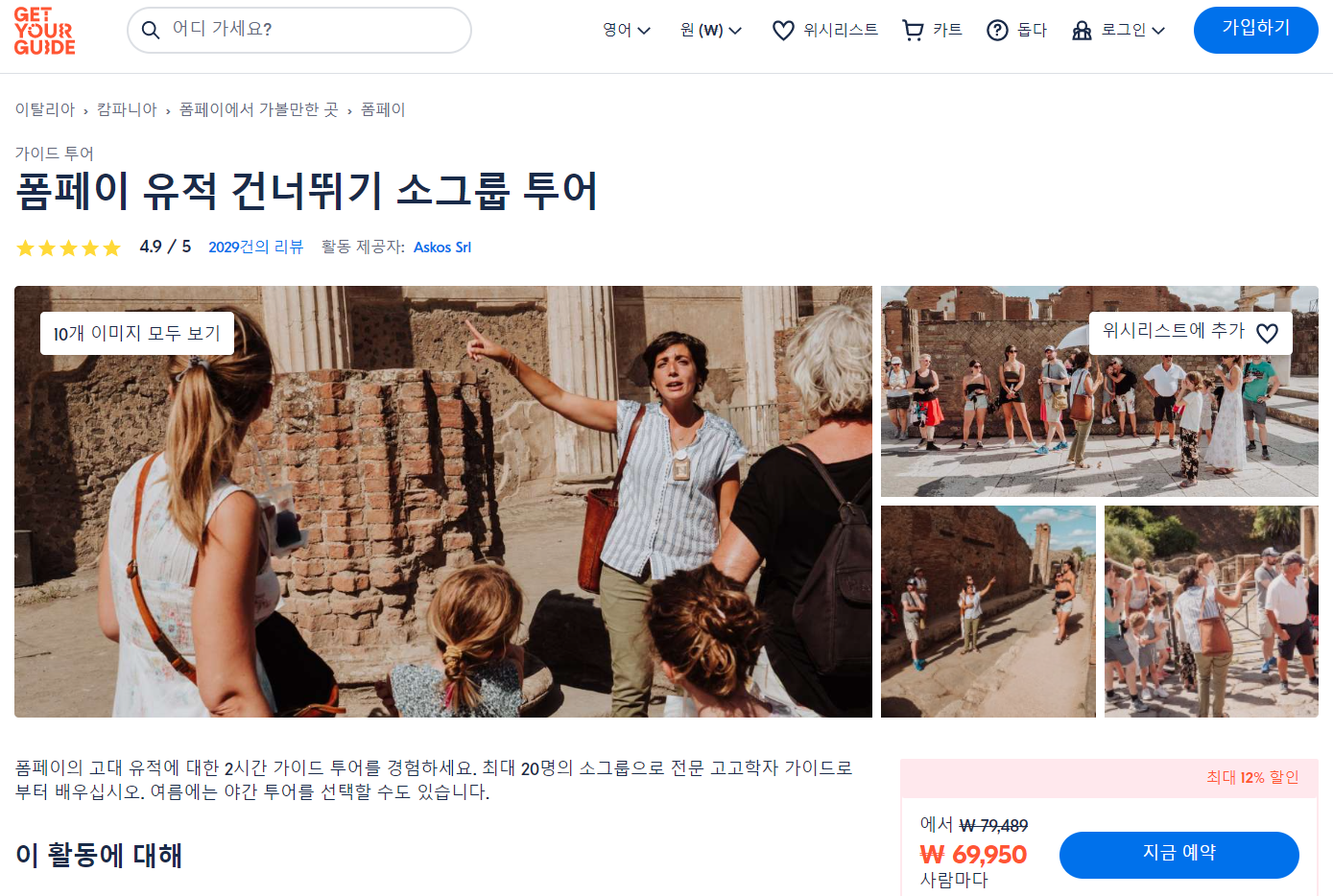 폼페이의 고대 유적 2시간 가이드 투어는 GET YOUR GUIDE 사이트에서 예약하실 수 있습니다. 사이트는 특히 전세계 대부분의 나라, 지역의 투어, 교통편 있어, 쉽게 찾을 수 없는 여행지의 다양한 투어 및 서비스를 이용할 수 있는 글로벌 사이트로 한국어사이트는 지원하지 않습니다. (글로벌 한국어 여행사이트를 찾으신다면 klook 여행사이트 추천합니다. 함께 사용하시면 더욱 편하게 여행하실 수 있습니다. klook에 찾는 정보가 없다면 GET YOUR GUIDE에서 찾으시면 됩니다.)