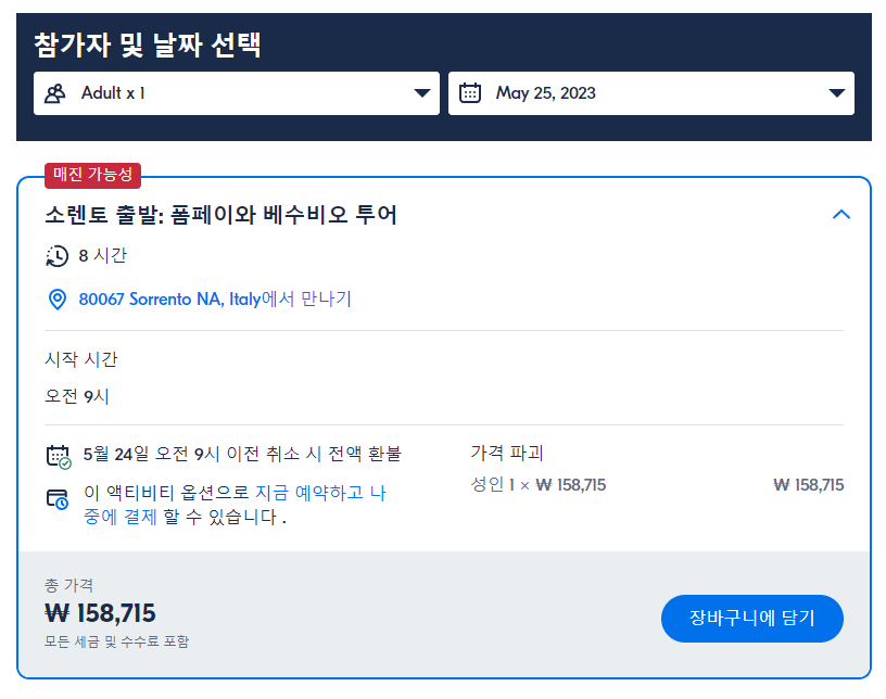 소렌토 출발 폼페이와 베수비오 투어 (Pompeii and Vesuvius Tour From Sorrento)는 GET YOUR GUIDE 사이트에서 예약하실 수 있습니다. 사이트는 특히 전세계 대부분의 나라, 지역의 투어, 교통편 있어, 쉽게 찾을 수 없는 여행지의 다양한 투어 및 서비스를 이용할 수 있는 글로벌 사이트로 한국어사이트는 지원하지 않습니다. (글로벌 한국어 여행사이트를 찾으신다면 klook 여행사이트 추천합니다. 함께 사용하시면 더욱 편하게 여행하실 수 있습니다. klook에 찾는 정보가 없다면 GET YOUR GUIDE에서 찾으시면 됩니다.)