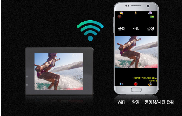 액션캠 자체 와이파이를 사용하여 스마트폰과 연결하면 스마트폰 화면에 촬영하고
