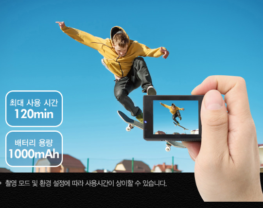 타사 액션캠 배터리보다 20% 증가된 배터리 용량인 1000mAh 대용량