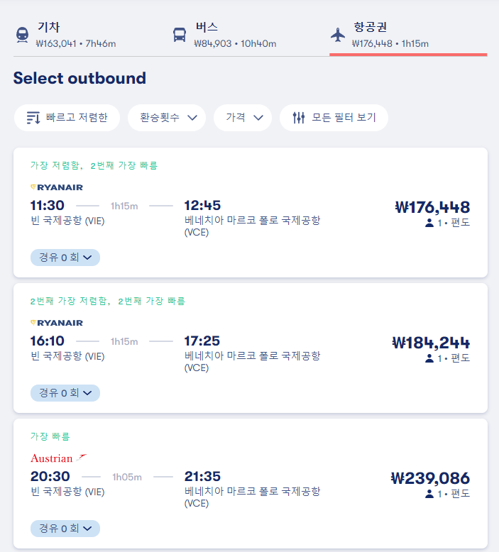 비엔나에서 베네치아(베니스) 이동하는 항공 교통편