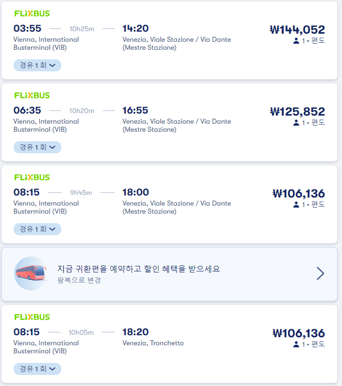 비엔나에서 베네치아(베니스)로 가는 교통편 노선정보 및 예약은 12go사이트에서 예약하실 수 있으며, 이 노선 뿐만아니라 나라전역의 노선, 나라간 노선의 검색가능한 모든 교통편을 검색하고 예약하실 수 있습니다. 한국어로 검색해보시고 나오지 않으면 영어로 검색하시면 보다 쉽게 노선을 확인하실 수 있습니다.