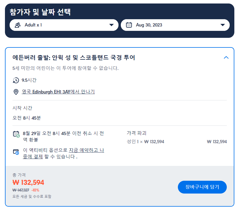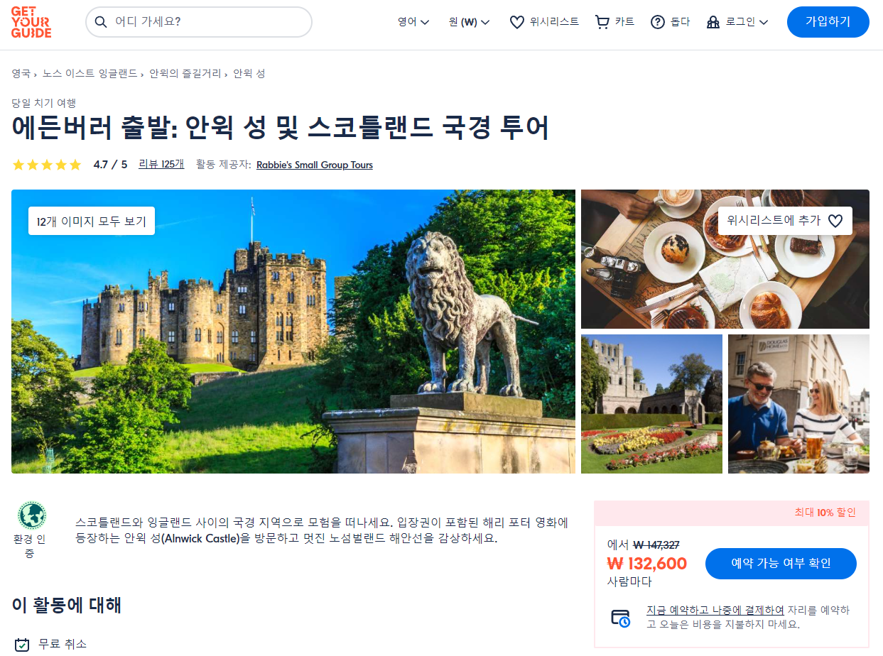 에든버러 출발 안윅 성 및 스코틀랜드 국경 투어 (Alnwick Castle and Scottish Borders Tour From Edinburgh)는 GET YOUR GUIDE 사이트에서 예약하실 수 있습니다. 사이트는 특히 전세계 대부분의 나라, 지역의 투어, 교통편 있어, 쉽게 찾을 수 없는 여행지의 다양한 투어 및 서비스를 이용할 수 있는 글로벌 사이트로 한국어사이트는 지원하지 않습니다. (글로벌 한국어 여행사이트를 찾으신다면 klook 여행사이트 추천합니다. 함께 사용하시면 더욱 편하게 여행하실 수 있습니다. klook에 찾는 정보가 없다면 GET YOUR GUIDE에서 찾으시면 됩니다.)