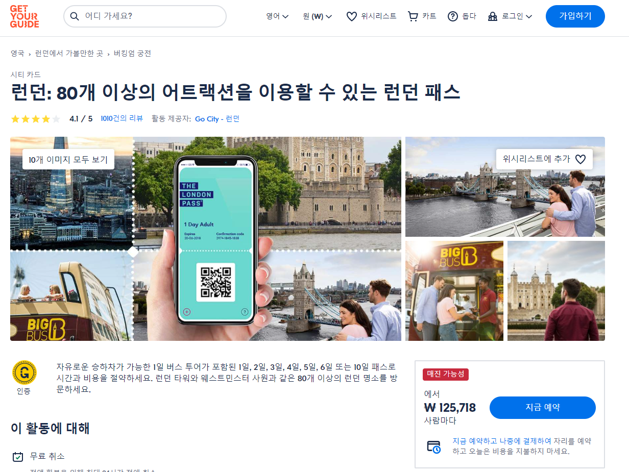 런던패스(The London Pass)는 GET YOUR GUIDE 사이트에서 예약하실 수 있습니다. 사이트는 특히 전세계 대부분의 나라, 지역의 투어, 교통편 있어, 쉽게 찾을 수 없는 여행지의 다양한 투어 및 서비스를 이용할 수 있는 글로벌 사이트로 한국어사이트는 지원하지 않습니다. (글로벌 한국어 여행사이트를 찾으신다면 klook 여행사이트 추천합니다. 함께 사용하시면 더욱 편하게 여행하실 수 있습니다. klook에 찾는 정보가 없다면 GET YOUR GUIDE에서 찾으시면 됩니다.)