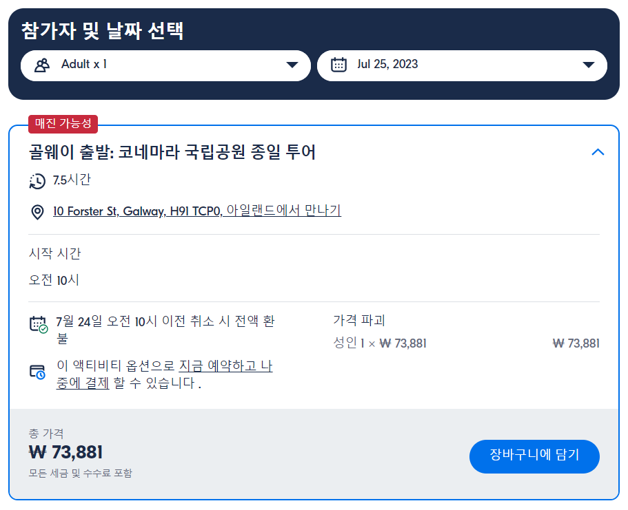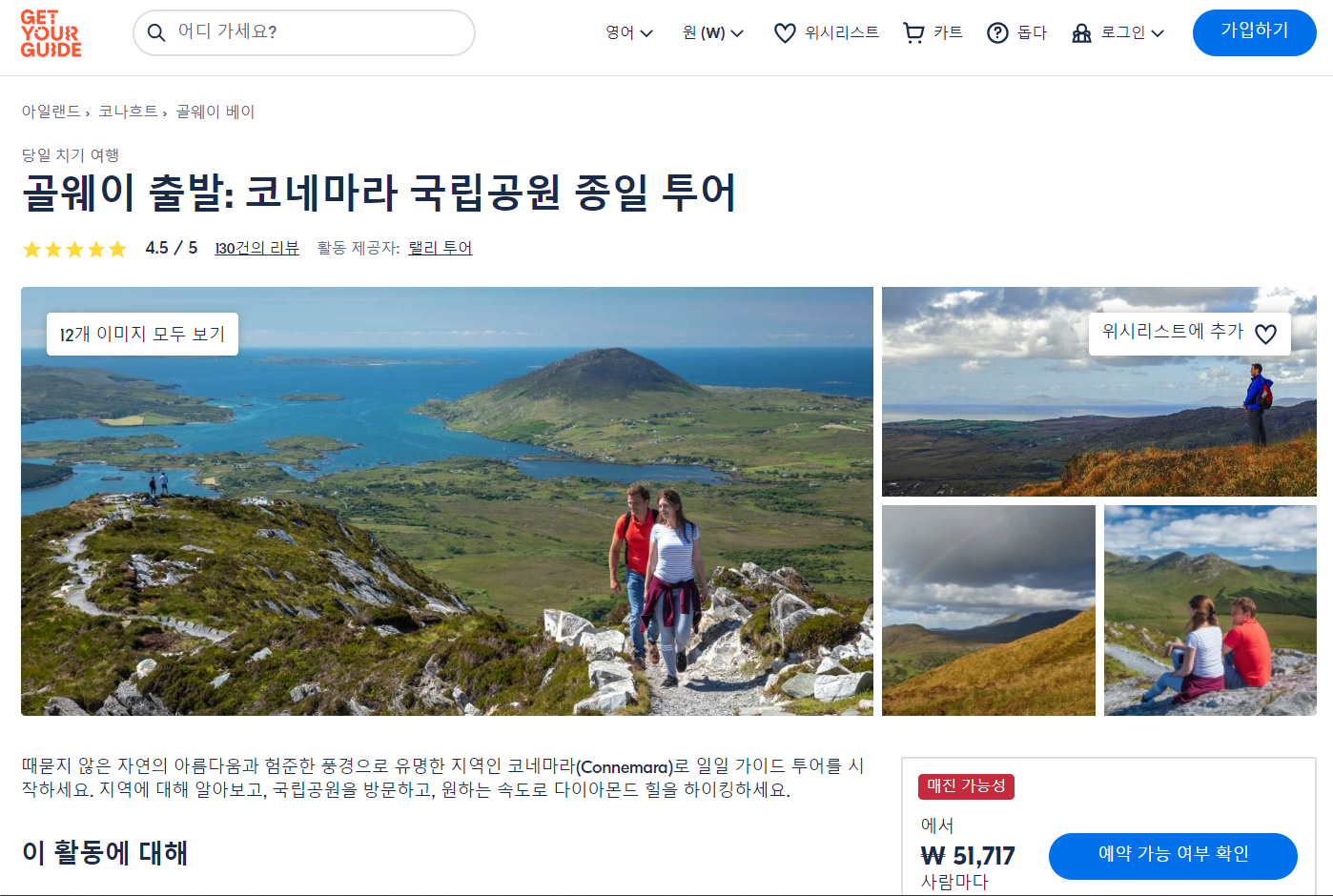골웨이출발 코네마라 국립공원 종일 투어(Connemara National Park Full Day Tour From Galway)는 GET YOUR GUIDE 사이트에서 예약하실 수 있습니다. 사이트는 특히 전세계 대부분의 나라, 지역의 투어, 교통편 있어, 쉽게 찾을 수 없는 여행지의 다양한 투어 및 서비스를 이용할 수 있는 글로벌 사이트로 한국어사이트는 지원하지 않습니다. (글로벌 한국어 여행사이트를 찾으신다면 klook 여행사이트 추천합니다. 함께 사용하시면 더욱 편하게 여행하실 수 있습니다. klook에 찾는 정보가 없다면 GET YOUR GUIDE에서 찾으시면 됩니다.)