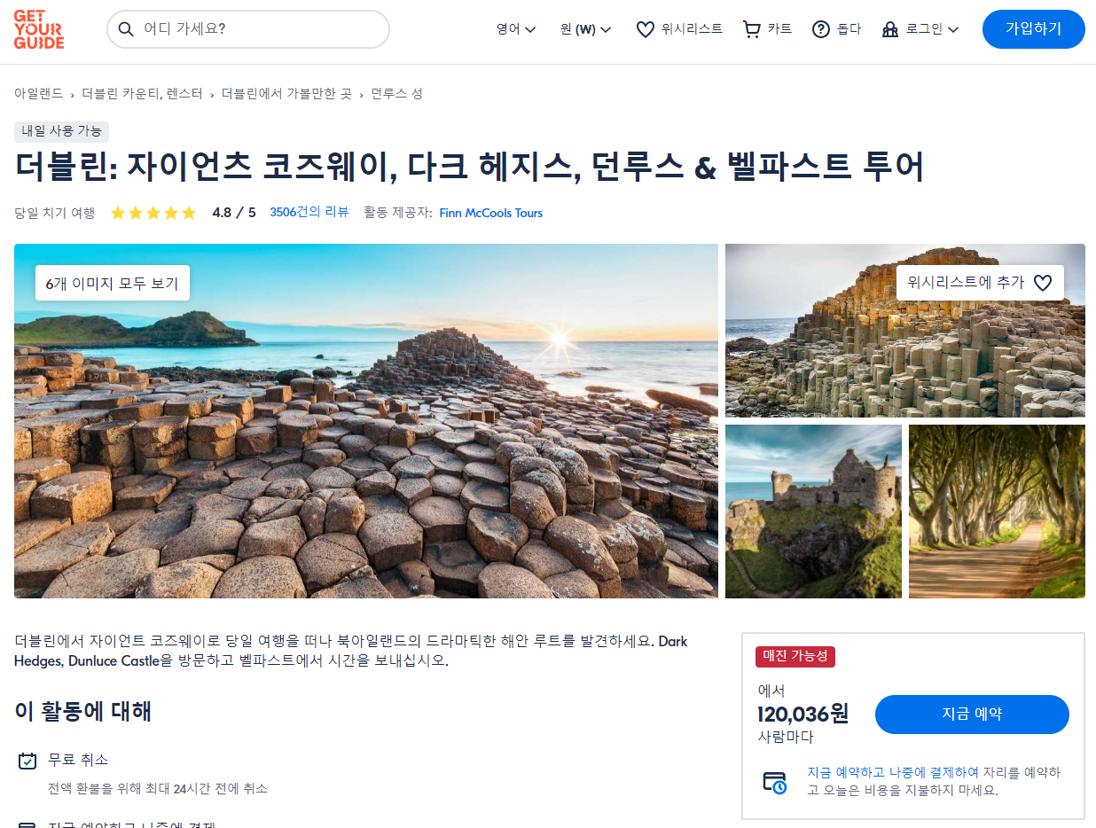 더블린에서 출발하는 자이언츠 코즈웨이, 다크 헤지스, 던루스 & 벨파스트 투어는 GET YOUR GUIDE 사이트에서 예약하실 수 있습니다. 사이트는 특히 전세계 대부분의 나라, 지역의 투어, 교통편 있어, 쉽게 찾을 수 없는 여행지의 다양한 투어 및 서비스를 이용할 수 있는 글로벌 사이트로 한국어사이트는 지원하지 않습니다. (글로벌 한국어 여행사이트를 찾으신다면 klook 여행사이트 추천합니다. 함께 사용하시면 더욱 편하게 여행하실 수 있습니다. klook에 찾는 정보가 없다면 GET YOUR GUIDE에서 찾으시면 됩니다.)