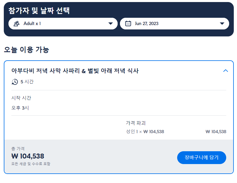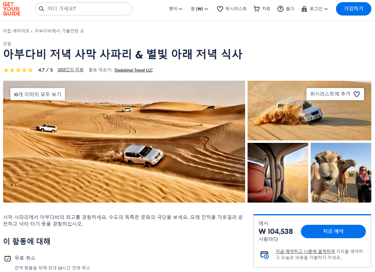 아부다비여행 저녁 사막 사파리 & 별빛 아래 저녁 식사(Abu Dhabi Evening Desert Safari & Dinner Under the Stars)는 GET YOUR GUIDE 사이트에서 예약하실 수 있습니다. 사이트는 특히 전세계 대부분의 나라, 지역의 투어, 교통편 있어, 쉽게 찾을 수 없는 여행지의 다양한 투어 및 서비스를 이용할 수 있는 글로벌 사이트로 한국어사이트는 지원하지 않습니다. (글로벌 한국어 여행사이트를 찾으신다면 klook 여행사이트 추천합니다. 함께 사용하시면 더욱 편하게 여행하실 수 있습니다. klook에 찾는 정보가 없다면 GET YOUR GUIDE에서 찾으시면 됩니다.)