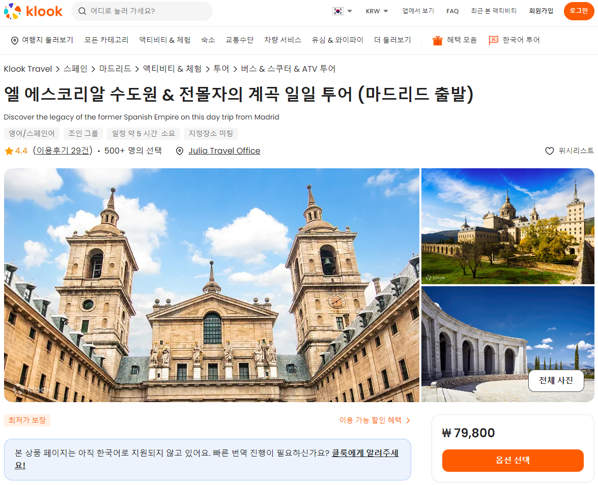 마드리드 출발 엘 에스코리알 수도원 & 전몰자의 계곡 일일 투어는 클룩사이트에서 쉽게 예약하실 수 있으며, 현재 할인된 금액에 이용하실 수 있습니다.