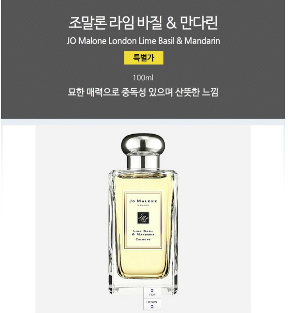 Tassting Note 만다린,바질앰버우드 조말론 런던의 시그이처 향수로, 열정적인 허브의 독특한 조합으로 이루어짐. 카리브해의 산들바람에서 실려온 듯한 라임향에 톡쏘는 바질과 향기로운 백리향이 더해져서 독특한 조합을 만들어 냅니다. 현대적인 감각의 클래식한 향입니다.
