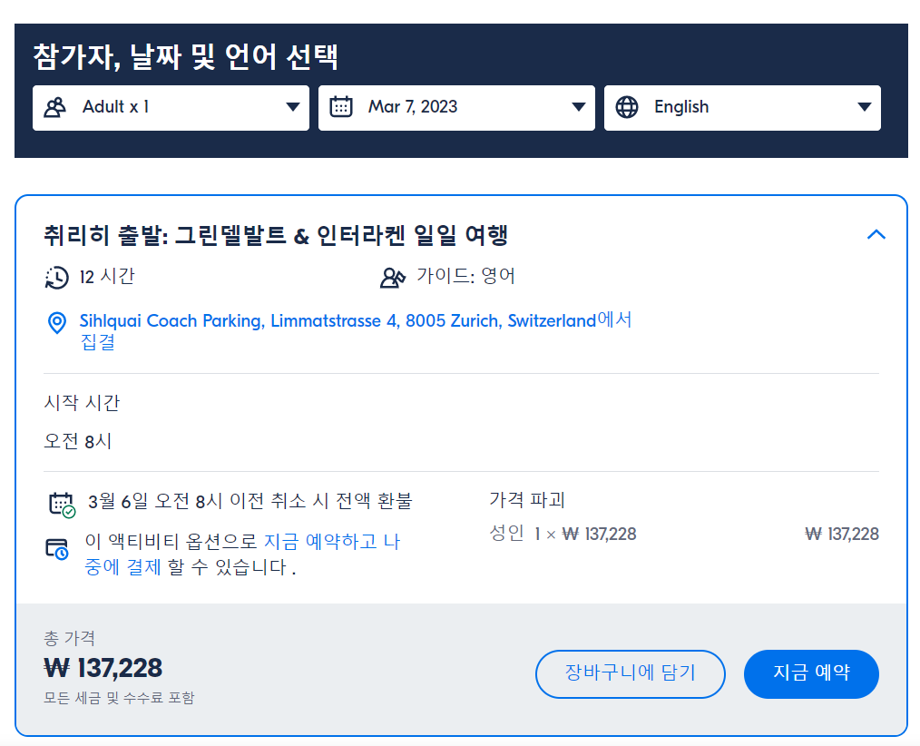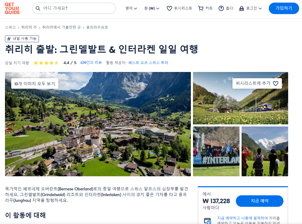 취리히 출발 그린델발트와 인터라켄 일일 여행은 GET YOUR GUIDE 사이트에서 예약하실 수 있습니다. 사이트는 특히 전세계 대부분의 나라, 지역의 투어, 교통편 있어, 쉽게 찾을 수 없는 여행지의 다양한 투어 및 서비스를 이용할 수 있는 글로벌 사이트로 한국어사이트는 지원하지 않습니다. (글로벌 한국어 여행사이트를 찾으신다면 klook 여행사이트 추천합니다. 함께 사용하시면 더욱 편하게 여행하실 수 있습니다. klook에 찾는 정보가 없다면 GET YOUR GUIDE에서 찾으시면 됩니다.)