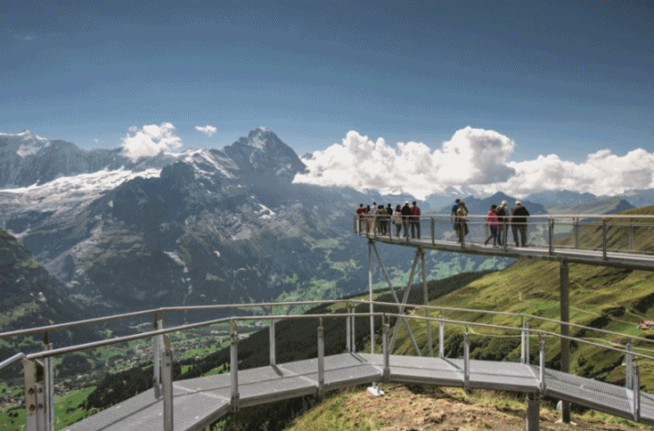 오리엔테이션 후 "빙하 마을"이라고도 알려진 그린델발트로 계속 이동합니다. 전망대에서는 아이거(Eiger), 묀히(Mönch), 융프라우(Jungfrau)의 삼중 봉우리를 포함하여 인상적인 산악 경관의 멋진 전망을 제공합니다.