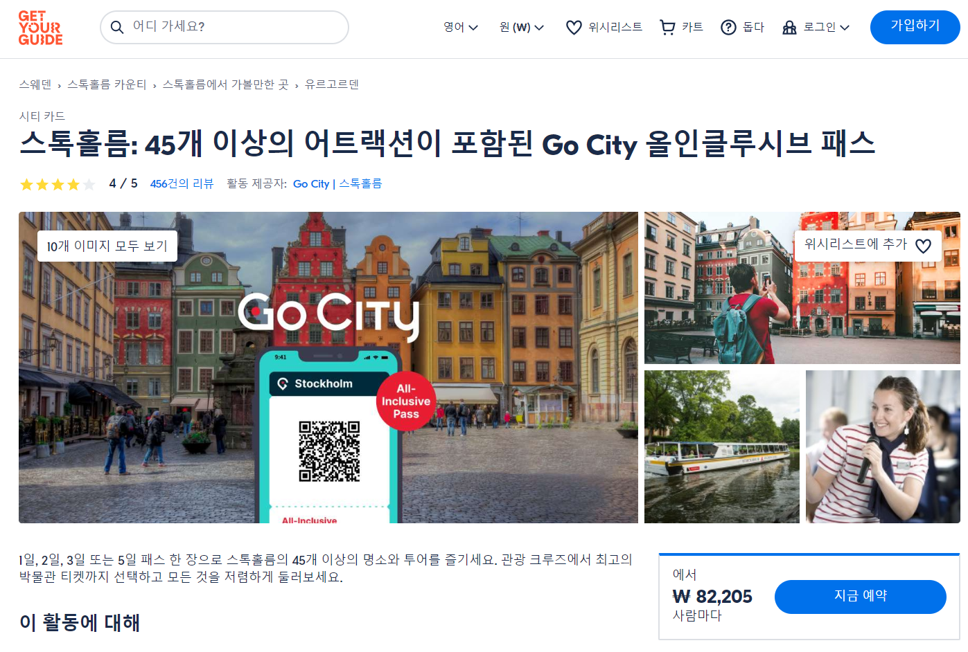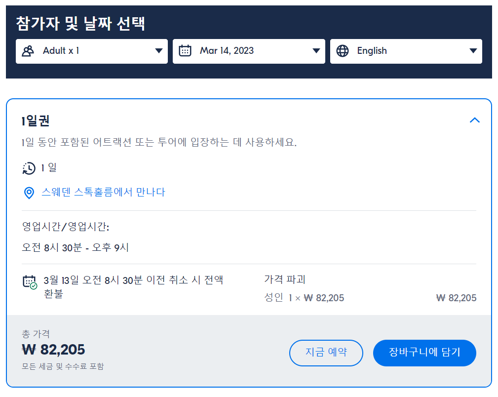 스톡홀름 고시티(Go City) 올인클루시브 패스는 GET YOUR GUIDE 사이트에서 예약하실 수 있습니다. 사이트는 특히 전세계 대부분의 나라, 지역의 투어, 교통편 있어, 쉽게 찾을 수 없는 여행지의 다양한 투어 및 서비스를 이용할 수 있는 글로벌 사이트로 한국어사이트는 지원하지 않습니다. (글로벌 한국어 여행사이트를 찾으신다면 klook 여행사이트 추천합니다. 함께 사용하시면 더욱 편하게 여행하실 수 있습니다. klook에 찾는 정보가 없다면 GET YOUR GUIDE에서 찾으시면 됩니다.)