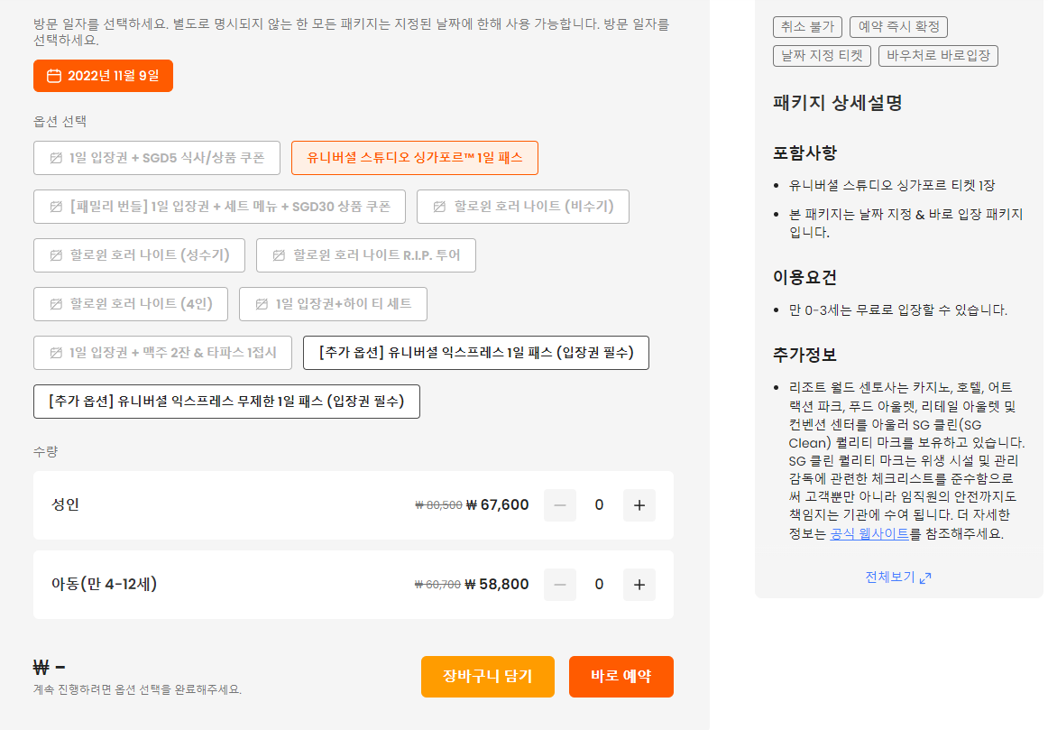싱가포르 유니버셜 스튜디오 다양한 옵션 패키지