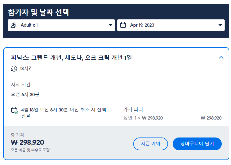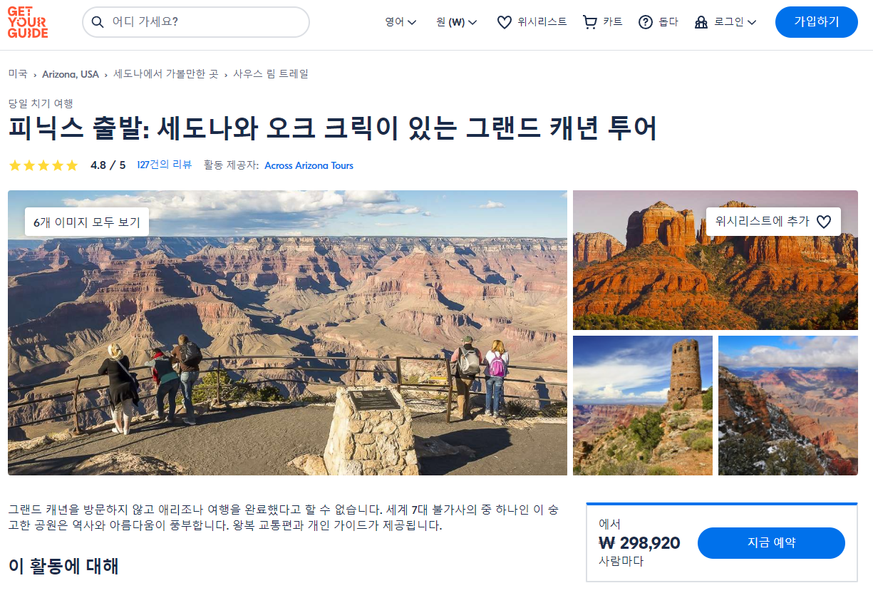 피닉스출발 세도나와 오크 크릭이 있는 그랜드 캐년 투어는 GET YOUR GUIDE 사이트에서 예약하실 수 있습니다. 사이트는 특히 전세계 대부분의 나라, 지역의 투어, 교통편 있어, 쉽게 찾을 수 없는 여행지의 다양한 투어 및 서비스를 이용할 수 있는 글로벌 사이트로 한국어사이트는 지원하지 않습니다. (글로벌 한국어 여행사이트를 찾으신다면 klook 여행사이트 추천합니다. 함께 사용하시면 더욱 편하게 여행하실 수 있습니다. klook에 찾는 정보가 없다면 GET YOUR GUIDE에서 찾으시면 됩니다.)