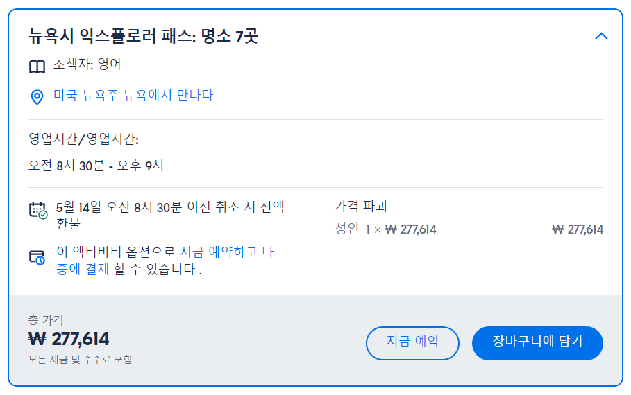 뉴욕 95개 이상의 투어 및 관광명소 중 선택하여 이용하는 뉴욕 고시티익스플로러패스는 GET YOUR GUIDE 사이트에서 예약하실 수 있습니다. 사이트는 특히 전세계 대부분의 나라, 지역의 투어, 교통편 있어, 쉽게 찾을 수 없는 여행지의 다양한 투어 및 서비스를 이용할 수 있는 글로벌 사이트로 한국어사이트는 지원하지 않습니다. (글로벌 한국어 여행사이트를 찾으신다면 klook 여행사이트 추천합니다. 함께 사용하시면 더욱 편하게 여행하실 수 있습니다. klook에 찾는 정보가 없다면 GET YOUR GUIDE에서 찾으시면 됩니다.)