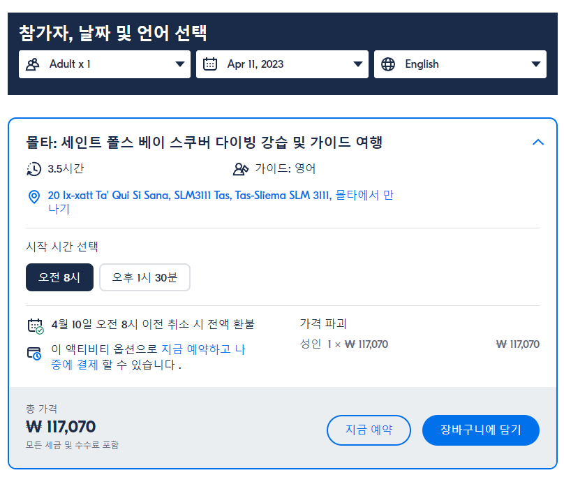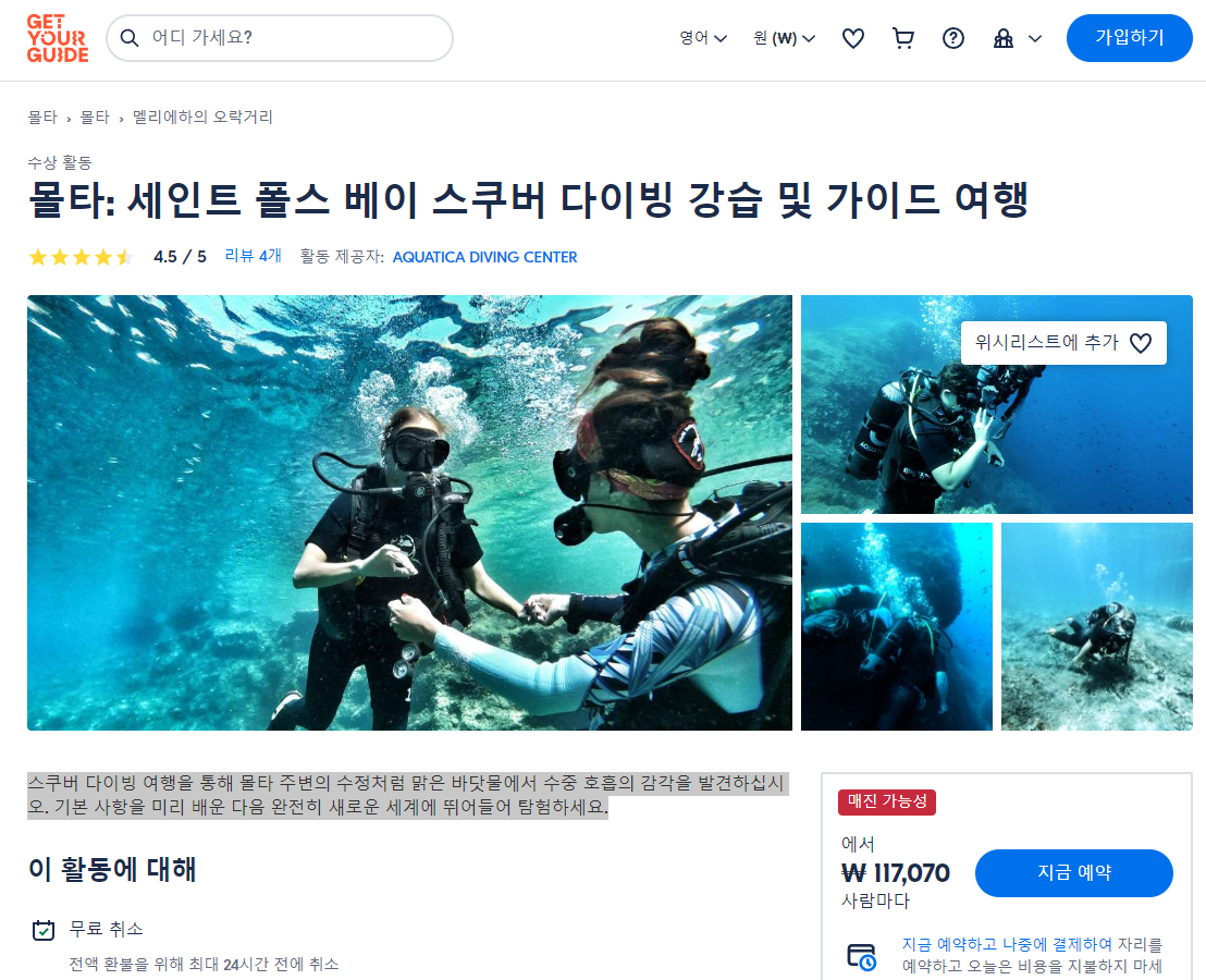 몰타 세인트 폴스 베이 스쿠버 다이빙 강습 및 가이드 투어는 GET YOUR GUIDE 사이트에서 예약하실 수 있습니다. 사이트는 특히 전세계 대부분의 나라, 지역의 투어, 교통편 있어, 쉽게 찾을 수 없는 여행지의 다양한 투어 및 서비스를 이용할 수 있는 글로벌 사이트로 한국어사이트는 지원하지 않습니다. (글로벌 한국어 여행사이트를 찾으신다면 klook 여행사이트 추천합니다. 함께 사용하시면 더욱 편하게 여행하실 수 있습니다. klook에 찾는 정보가 없다면 GET YOUR GUIDE에서 찾으시면 됩니다.)