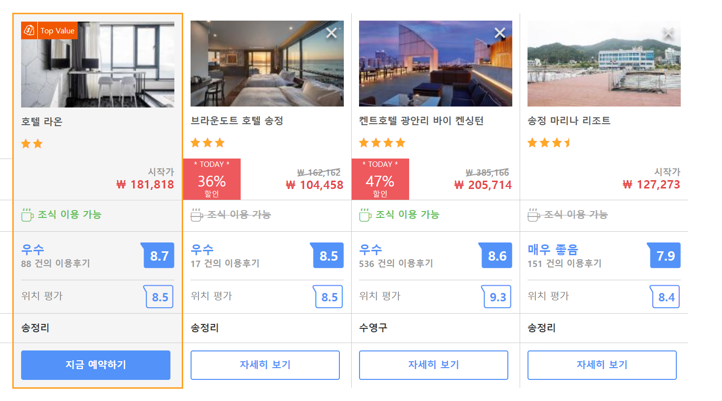 전객실 오션뷰에 객실마다 인테리어가 다른것도 너무좋고 바로앞이 비치라좋았어요 입구가 뒤쪽이어서 좀돌아가야하지만 카페도많고 위치적으론좋아요! 또 갈예정입니다