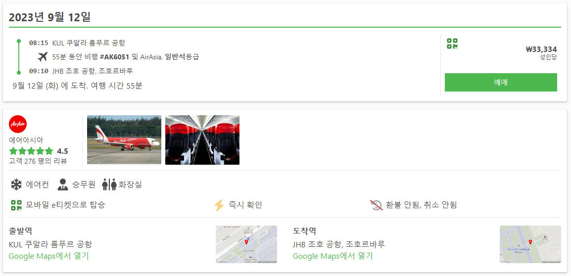쿠알라룸푸르에서 조호르바루 이동하는 교통편 노선정보 및 예약은 12go사이트에서 예약하실 수 있으며, 이 노선 뿐만아니라 나라전역의 노선, 나라간 노선의 검색가능한 모든 교통편을 검색하고 예약하실 수 있습니다. 한국어로 검색해보시고 나오지 않으면 영어로 검색하시면 보다 쉽게 노선을 확인하실 수 있습니다.