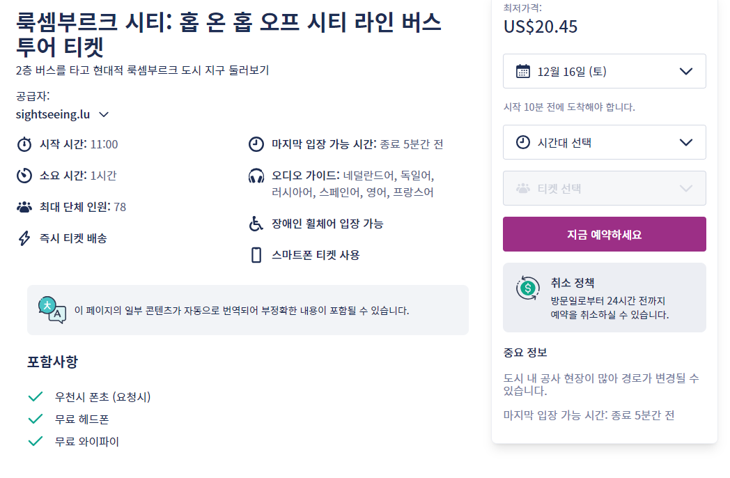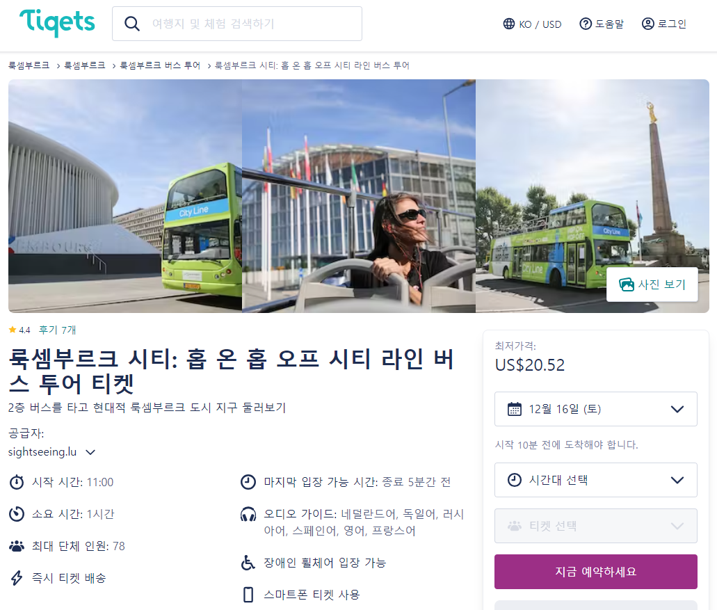 룩셈부르크 시티 홉온 홉오프 시티 라인 버스 투어 티켓은 tigets 온라인 사이트에서 간편하게 예약하실 수 있으며 이메일, 페이스북, 구글 아이디로 쉽게 회원가입이 가능합니다.