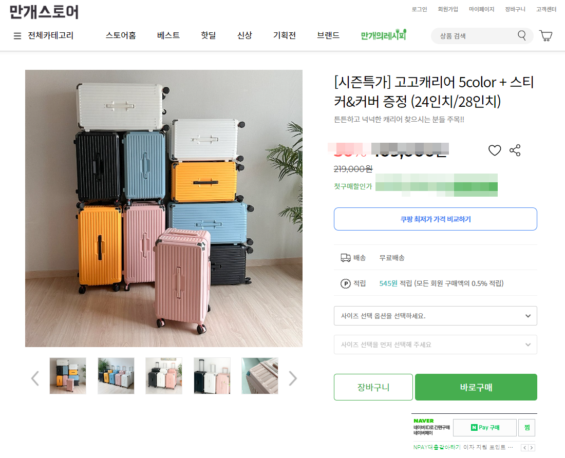 가볍고 튼튼하고 넉넉한 캐리어 찾으시는 분들 주목!! 고고캐리어 5color + 스티커&커버 증정 (24인치/28인치)은 현재 저렴한가격에 판매하고 있어 더욱 매리트 있고 매력적인 제품으로 할인이벤트는 기간에 따라 조기마감할 수 있고 예고없이 가격이나 할인율이 변동될 수 있습니다. 망설이면 비싸져요~ 지금사면 저렴하게 득템할 찬스입니다.