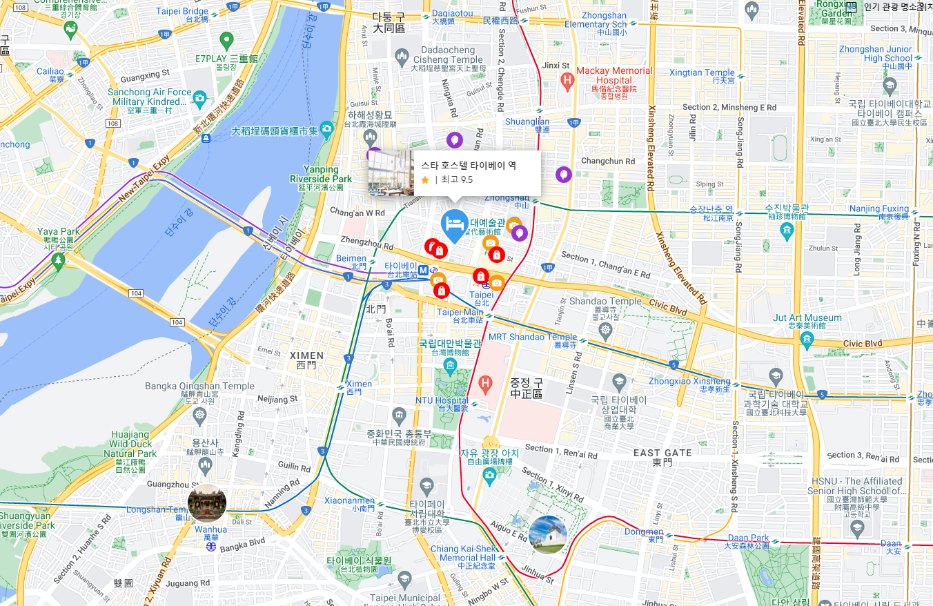 타이페이여행중 호텔위치로 좋은 시먼딩지역은 타이베이시내 중심지로 여행객들이 가장 많이 숙박하는 지역중의 한곳으로 약간 서울 명동분위기의 주변상권이 잘 발달되어 있는 곳입니다. 암