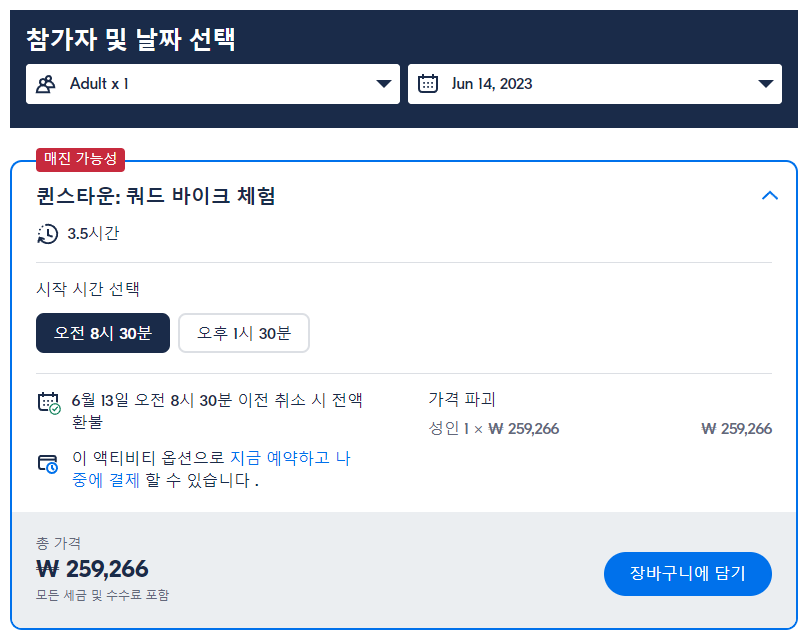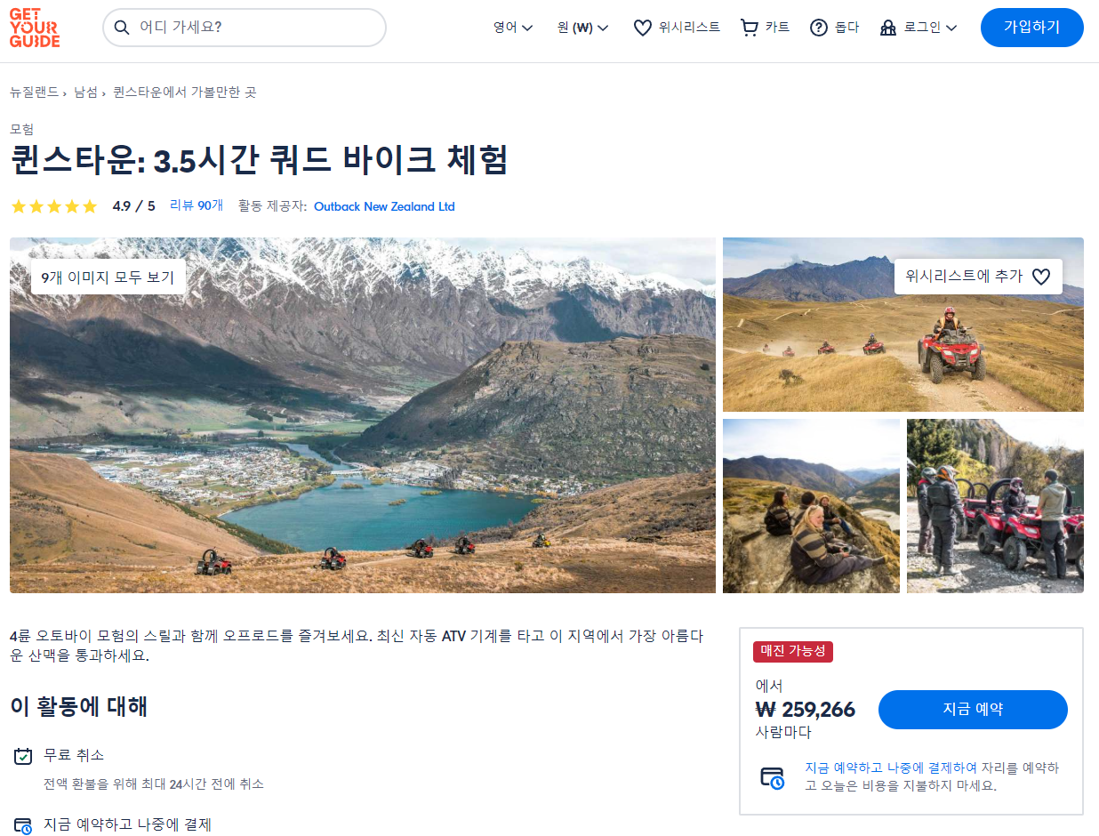 퀸스타운 3.5시간 쿼드 바이크 체험 (Queenstown 3.5-Hour Quad Biking Experience)은 GET YOUR GUIDE 사이트에서 예약하실 수 있습니다. 사이트는 특히 전세계 대부분의 나라, 지역의 투어, 교통편 있어, 쉽게 찾을 수 없는 여행지의 다양한 투어 및 서비스를 이용할 수 있는 글로벌 사이트로 한국어사이트는 지원하지 않습니다. (글로벌 한국어 여행사이트를 찾으신다면 klook 여행사이트 추천합니다. 함께 사용하시면 더욱 편하게 여행하실 수 있습니다. klook에 찾는 정보가 없다면 GET YOUR GUIDE에서 찾으시면 됩니다.)