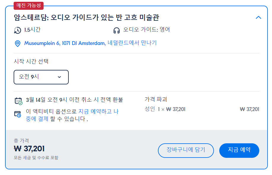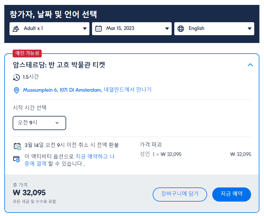 암스테르담 반 고흐 박물관 티켓은 GET YOUR GUIDE 사이트에서 예약하실 수 있습니다. 사이트는 특히 전세계 대부분의 나라, 지역의 투어, 교통편 있어, 쉽게 찾을 수 없는 여행지의 다양한 투어 및 서비스를 이용할 수 있는 글로벌 사이트로 한국어사이트는 지원하지 않습니다. (글로벌 한국어 여행사이트를 찾으신다면 klook 여행사이트 추천합니다. 함께 사용하시면 더욱 편하게 여행하실 수 있습니다. klook에 찾는 정보가 없다면 GET YOUR GUIDE에서 찾으시면 됩니다.)