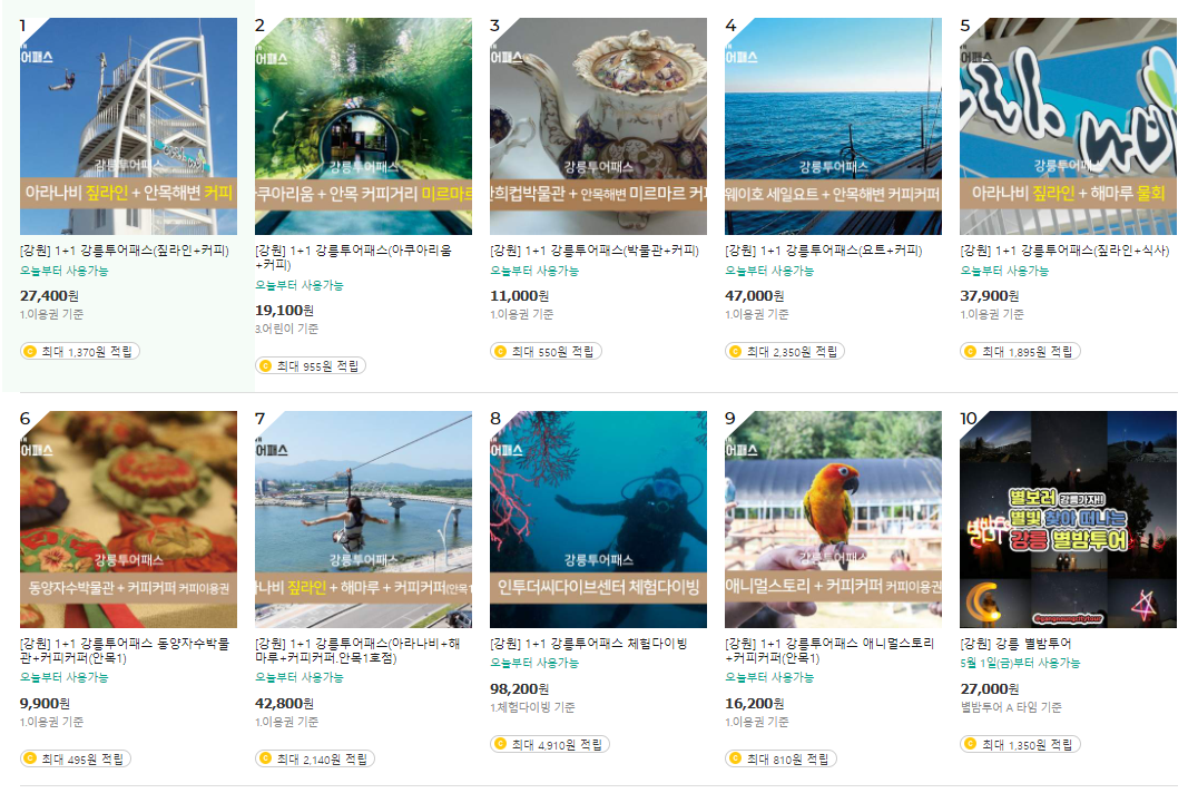 쿠팡사이트에 강릉투어패스를 검색하시면 다양한 강릉투어패스패키지를 확인하실 수 있습니다.