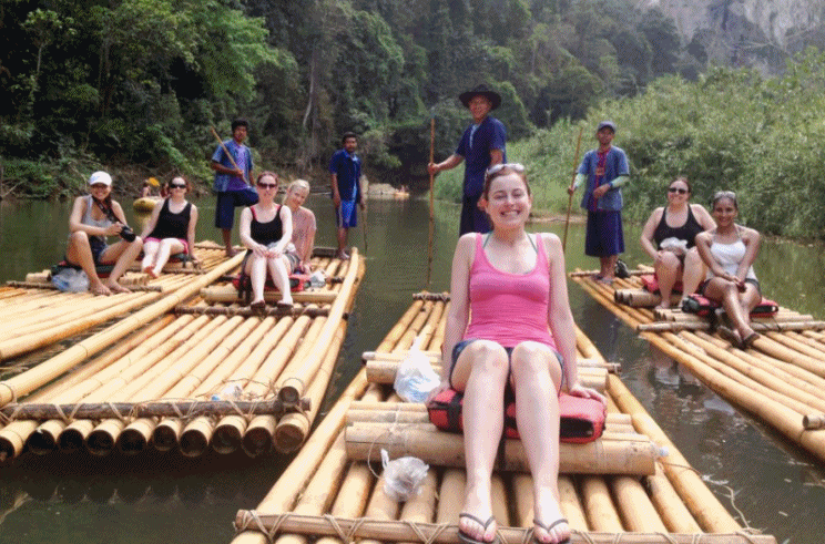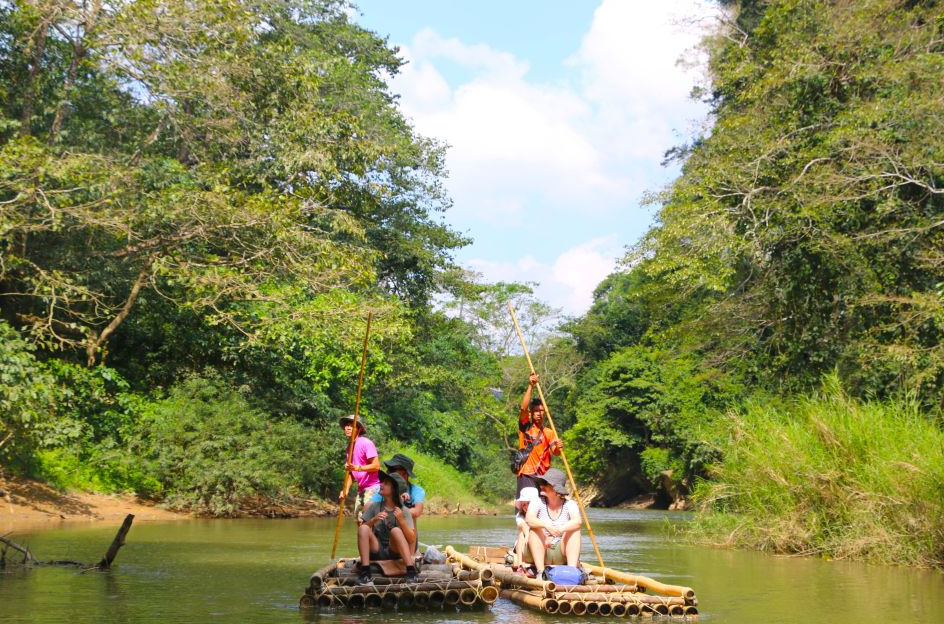 드라마틱한 석회암 산과 고요한 정글의 소리를 감상하며 가이드가 대나무 뗏목을 부드럽게 조종하며 하류로 내려가는 동안 휴식을 취하세요.