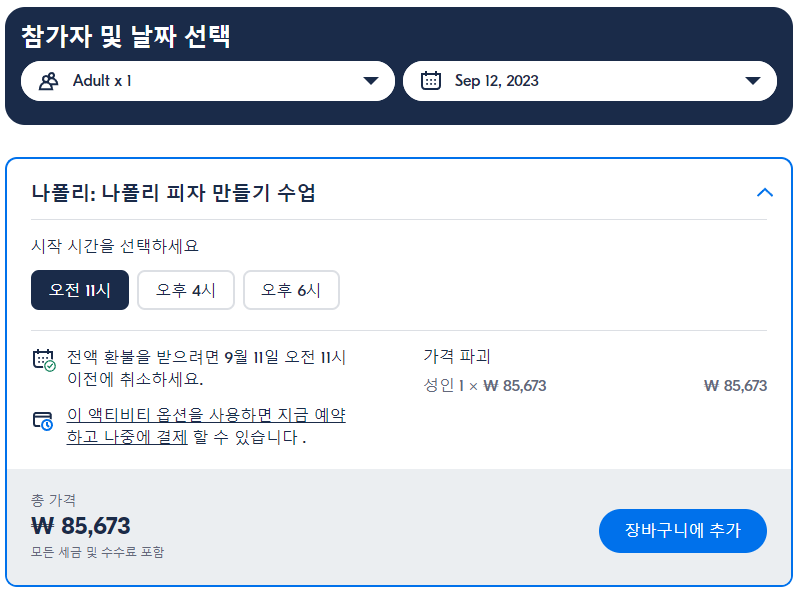 나폴리 피자 만들기 수업 (Naples Neapolitan Pizza Making Class)은 GET YOUR GUIDE 사이트에서 예약하실 수 있습니다. 사이트는 특히 전세계 대부분의 나라, 지역의 투어, 교통편 있어, 쉽게 찾을 수 없는 여행지의 다양한 투어 및 서비스를 이용할 수 있는 글로벌 사이트로 한국어사이트는 지원하지 않습니다. (글로벌 한국어 여행사이트를 찾으신다면 klook 여행사이트 추천합니다. 함께 사용하시면 더욱 편하게 여행하실 수 있습니다. klook에 찾는 정보가 없다면 GET YOUR GUIDE에서 찾으시면 됩니다.)