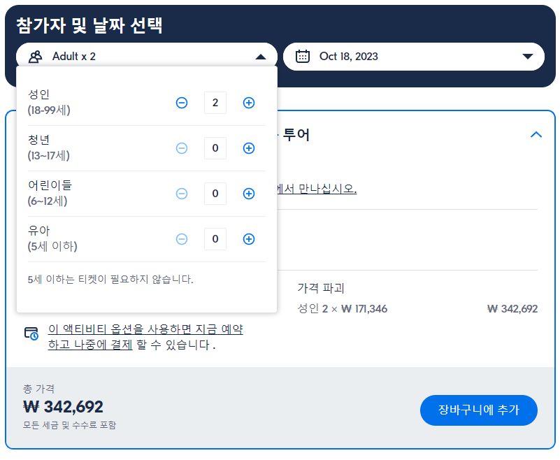 중요: 이 투어에는 최소 2명의 유료 성인이 필요합니다.