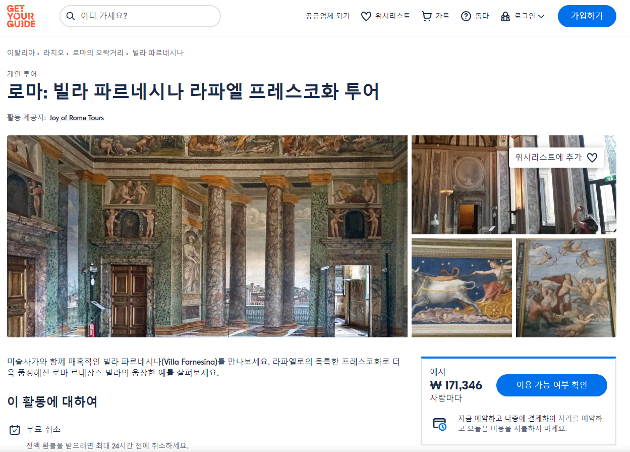 로마 빌라 파르네시나 라파엘 프레스코화 투어(Rome Villa Farnesina Raphael Frescoes Tour)는 GET YOUR GUIDE 사이트에서 예약하실 수 있습니다. 사이트는 특히 전세계 대부분의 나라, 지역의 투어, 교통편 있어, 쉽게 찾을 수 없는 여행지의 다양한 투어 및 서비스를 이용할 수 있는 글로벌 사이트로 한국어사이트는 지원하지 않습니다. (글로벌 한국어 여행사이트를 찾으신다면 klook 여행사이트 추천합니다. 함께 사용하시면 더욱 편하게 여행하실 수 있습니다. klook에 찾는 정보가 없다면 GET YOUR GUIDE에서 찾으시면 됩니다.)