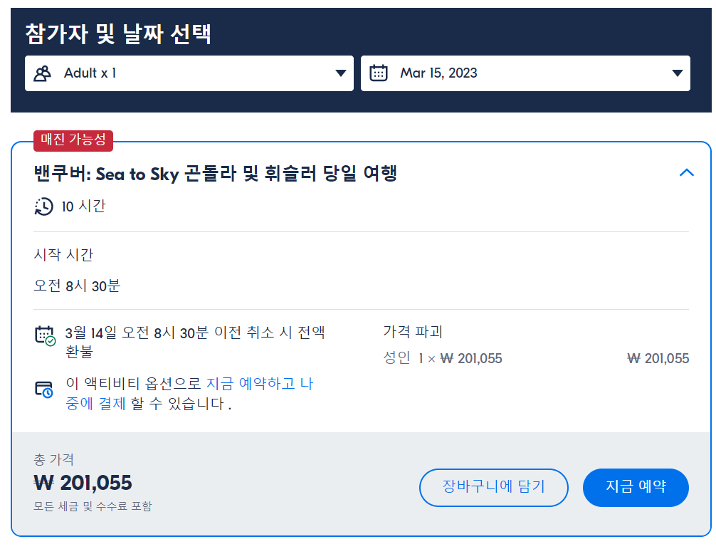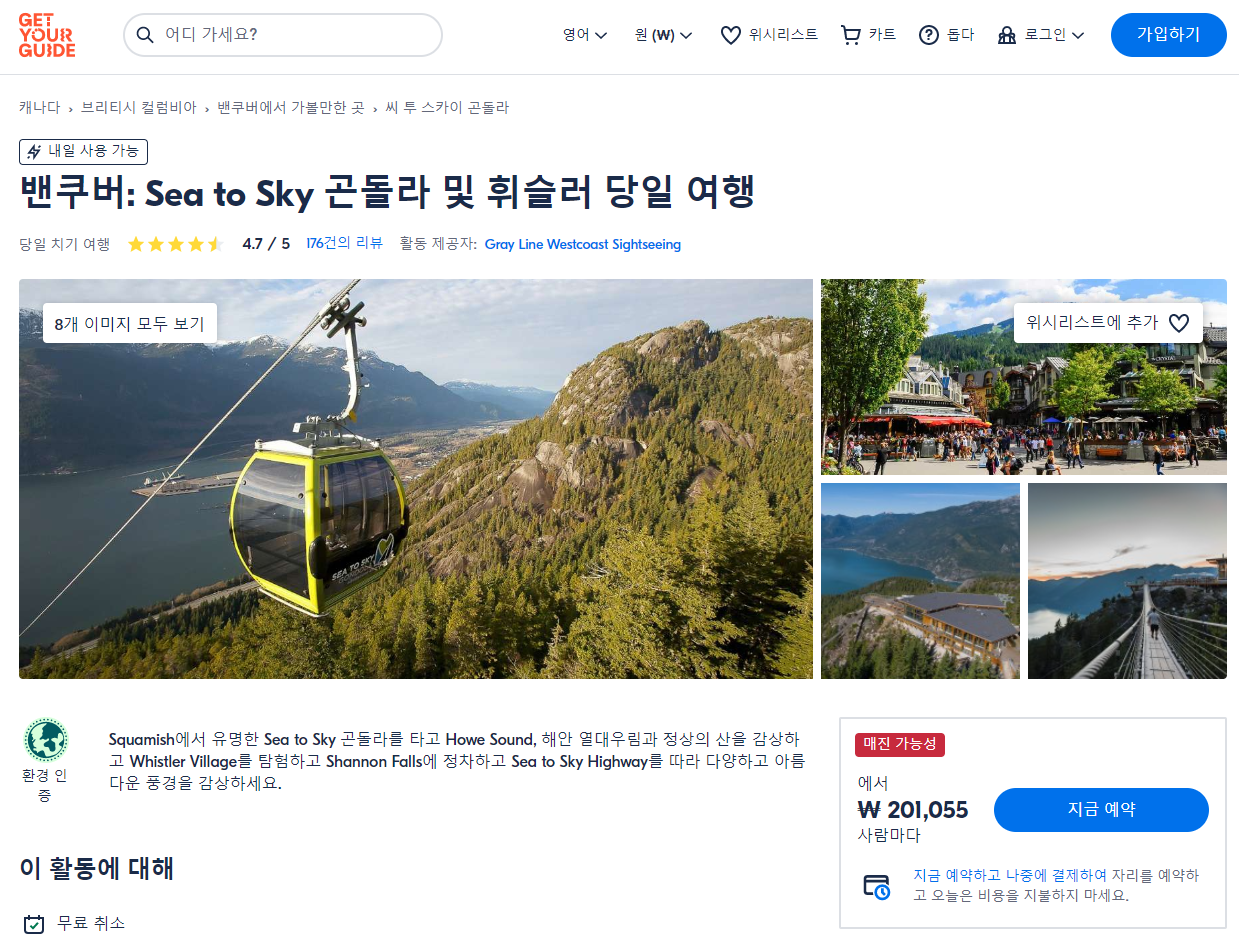 밴쿠버 Sea to Sky 곤돌라 및 휘슬러 당일 여행은 GET YOUR GUIDE 사이트에서 예약하실 수 있습니다. 사이트는 특히 전세계 대부분의 나라, 지역의 투어, 교통편 있어, 쉽게 찾을 수 없는 여행지의 다양한 투어 및 서비스를 이용할 수 있는 글로벌 사이트로 한국어사이트는 지원하지 않습니다. (글로벌 한국어 여행사이트를 찾으신다면 klook 여행사이트 추천합니다. 함께 사용하시면 더욱 편하게 여행하실 수 있습니다. klook에 찾는 정보가 없다면 GET YOUR GUIDE에서 찾으시면 됩니다.)