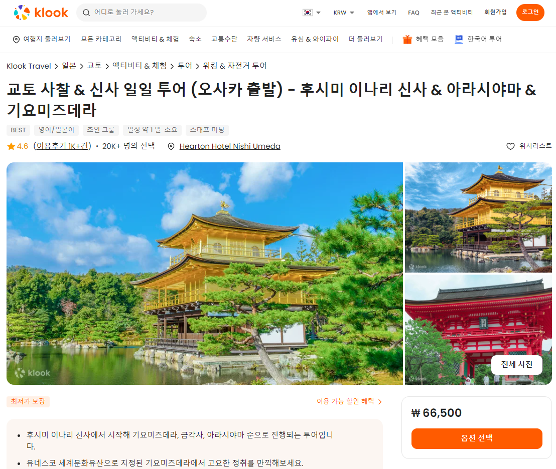오사카 출발 교토 사찰과 신사 일일 투어는 클룩사이트에서 쉽게 예약하실 수 있으며, 현재 할인된 금액에 이용하실 수 있습니다.