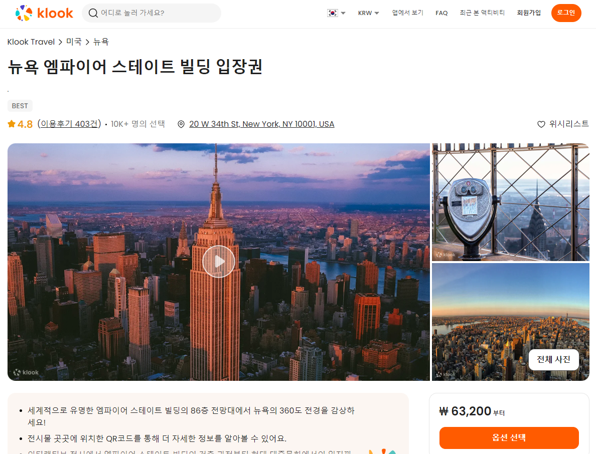 엠파이어 스테이트 빌딩 입장권은 클룩사이트에서 쉽게 예약하실 수 있으며, 이메일, 전화번호, 카카오톡, 네이버, 구글, 애플, 페이스복 등으로 간편하게 회원가입하고 이용하실 수 있습니다.