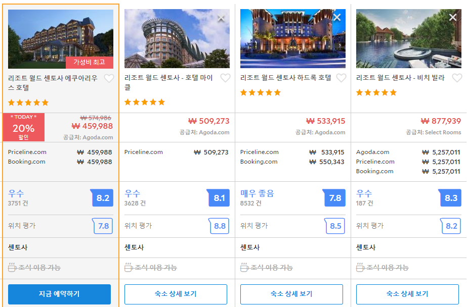 싱가포르 리조트 월드 센토사 에쿠아리우스 호텔의 최저 가격대는 아고다에서 할인특가 가격으로 매일매일 변동되며 40만원대부터 다양하게 형성됩니다. 아고다 최저가를 확인하시려면 아래 링크를 누르시면 원하는 날짜의 가격대를 자세히 보실 수 있습니다.