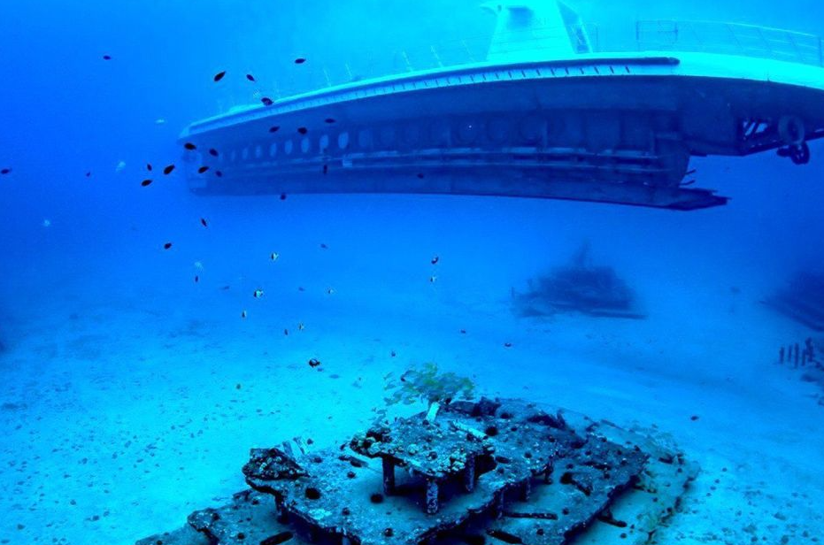 - 산호초와 난파선 위를 수중 잠수함 타기