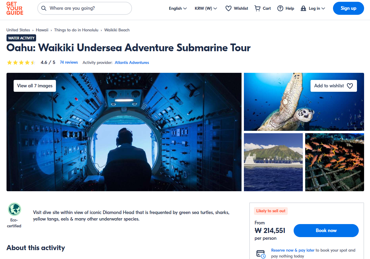 오아후 섬 와이키키 해저 어드벤처 잠수함 투어는 GET YOUR GUIDE 사이트에서 예약하실 수 있습니다. 사이트는 특히 전세계 대부분의 나라, 지역의 투어, 교통편 있어, 쉽게 찾을 수 없는 여행지의 다양한 투어 및 서비스를 이용할 수 있는 글로벌 사이트로 한국어사이트는 지원하지 않습니다. (글로벌 한국어 여행사이트를 찾으신다면 klook 여행사이트 추천합니다. 함께 사용하시면 더욱 편하게 여행하실 수 있습니다. klook에 찾는 정보가 없다면 GET YOUR GUIDE에서 찾으시면 됩니다.)