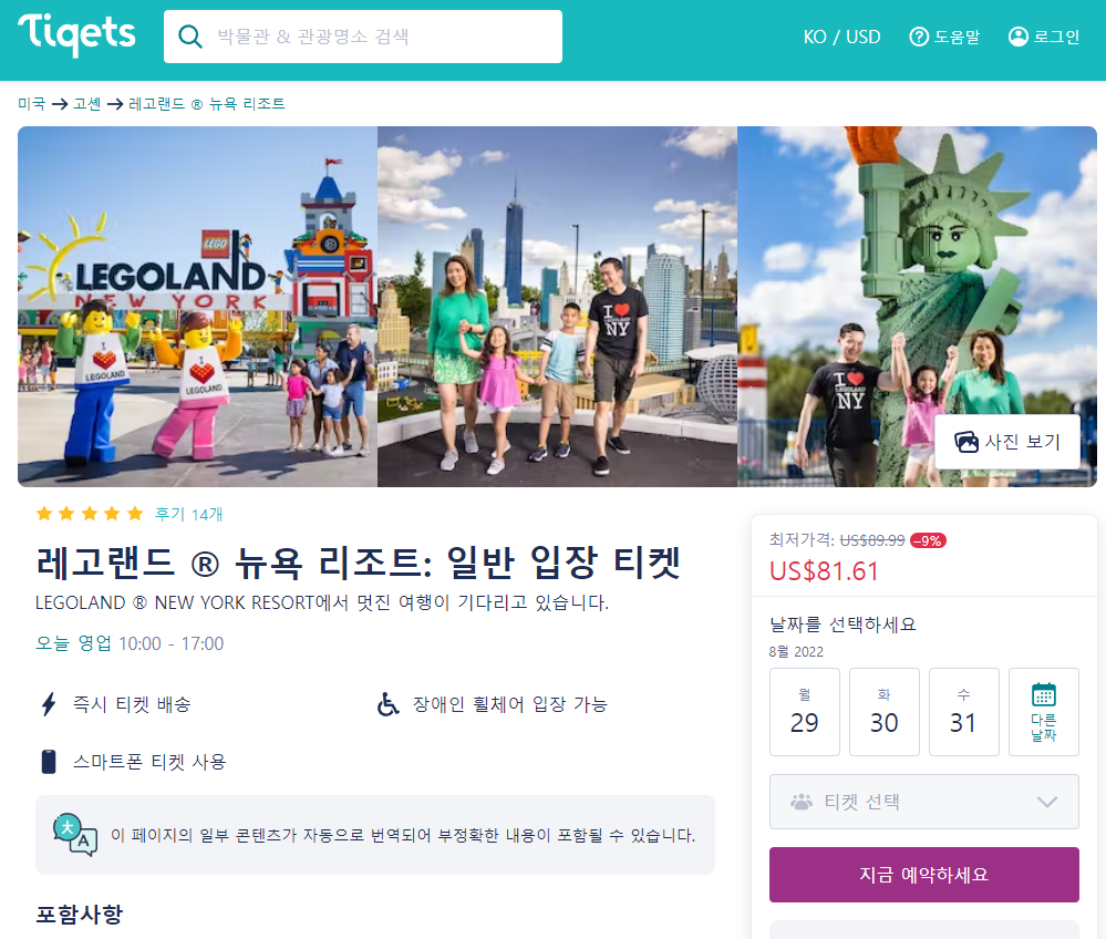 레고랜드 뉴욕 리조트 1일 일반 입장권은 tigets 온라인 사이트에서 간편하게 예약하실 수 있으며 이메일, 페이스북, 구글 아이디로 쉽게 회원가입이 가능합니다.