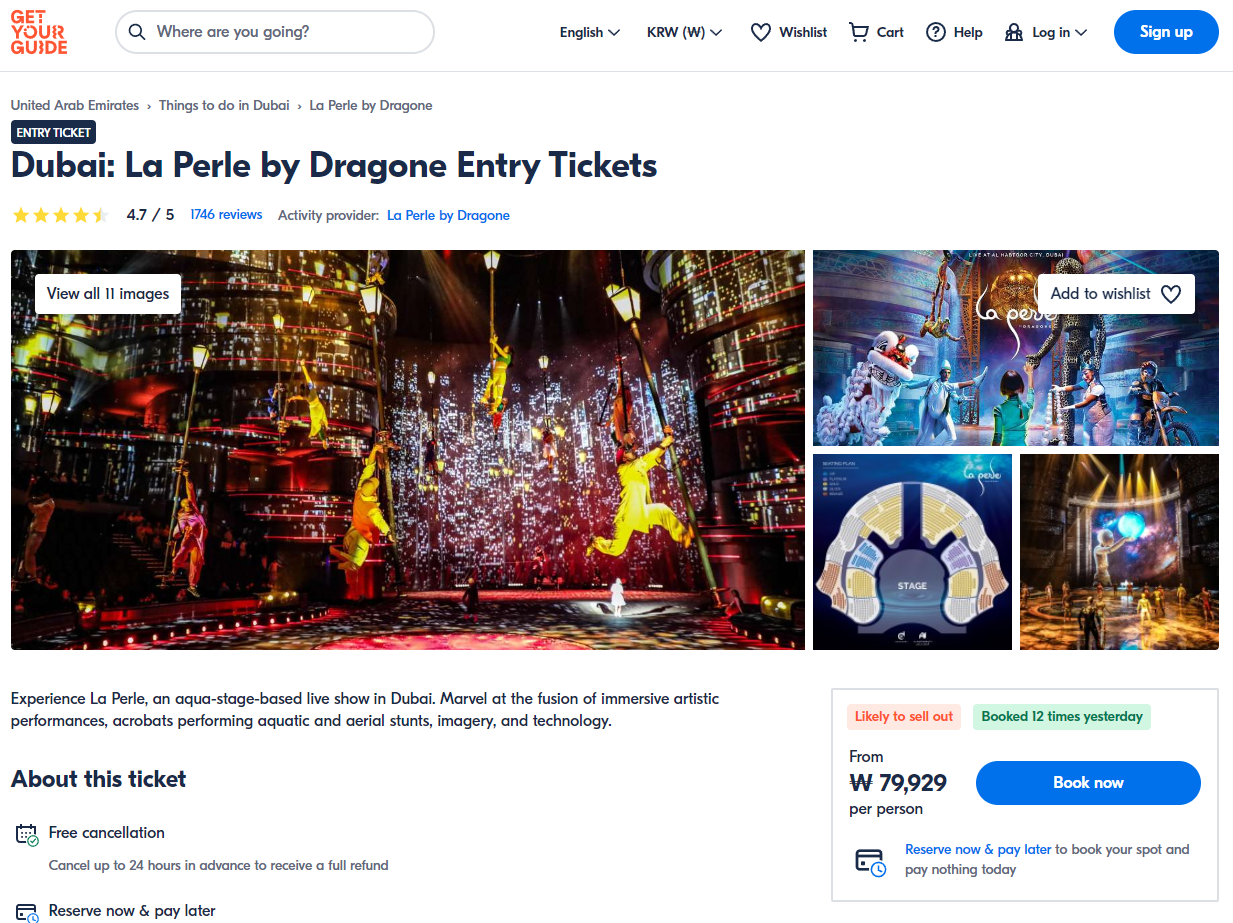 두바이서커스 La Perle by Dragone 몰입형 예술공연은 GET YOUR GUIDE 사이트에서 예약하실 수 있습니다. 사이트는 특히 전세계 대부분의 나라, 지역의 투어, 교통편 있어, 쉽게 찾을 수 없는 여행지의 다양한 투어 및 서비스를 이용할 수 있는 글로벌 사이트로 한국어사이트는 지원하지 않습니다. (글로벌 한국어 여행사이트를 찾으신다면 klook 여행사이트 추천합니다. 함께 사용하시면 더욱 편하게 여행하실 수 있습니다. klook에 찾는 정보가 없다면 GET YOUR GUIDE에서 찾으시면 됩니다.)