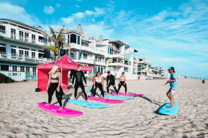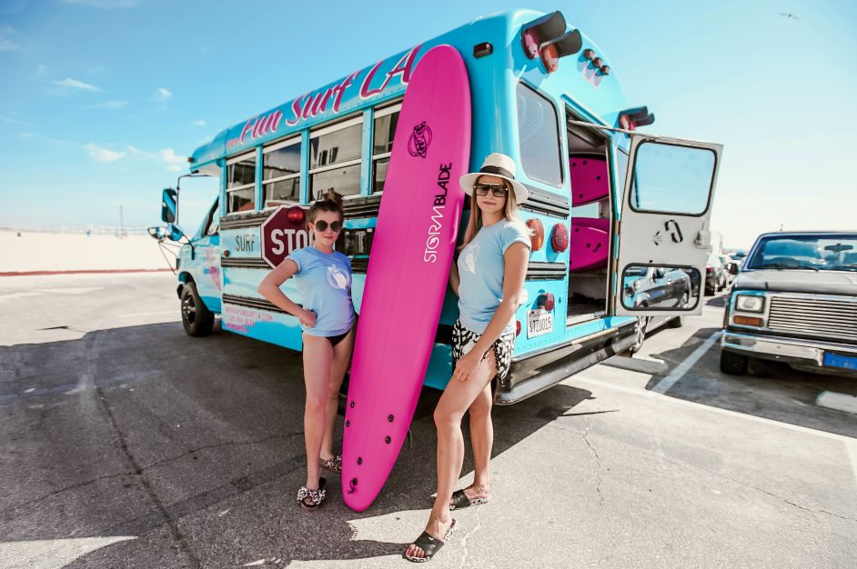 • FUN SURF LA 로고가 있는 파란색 서핑 스쿨 버스를 찾으세요.